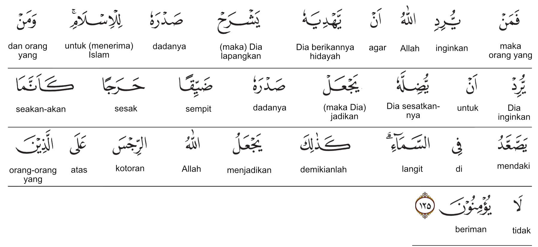 Kemenag RI 2019:Maka, siapa yang Allah kehendaki mendapat hidayah, Dia akan melapangkan dadanya untuk menerima Islam. Siapa yang Dia kehendaki menjadi sesat, Dia akan menjadikan dadanya sempit lagi sesak seakan-akan dia sedang mendaki ke langit. Begitulah Allah menimpakan siksa kepada orang-orang yang tidak beriman. Prof. Quraish Shihab:Maka, barang siapa (yang) Allah kehendaki untuk dianugerahi-Nya petunjuk (karena kecenderungan hatinya untuk memperoleh petunjuk), pasti Dia melapangkan dadanya untuk Islam. Dan barang siapa (yang) dikehendaki (Allah swt.) untuk disesatkan-Nya (karena kecenderungan hatinya untuk sesat), pasti Dia menjadikan dadanya sempit lagi sesak, bagaikan sedang mendaki di langit. Demikianlah Allah menimpakan siksa atas orang-orang yang tidak beriman. Prof. HAMKA:Dan barang siapa dikehendaki Allah hendak memberinya petunjuk, niscaya akan Dia bukakan dadanya buat (menerima) Islam. Dan barang siapa yang Dia kehendaki menyesatkannya, dijadikanlah dadanya sempit picik, seakan-akan dia akan meningkat ke langit. Seperti demikianlah Allah menjadikan kekotoran atas orang-orang yang tidak mau beriman.