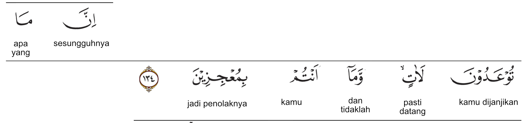 Huruf maa (مَا) artinya : apa. Kata tu’aduna (تُوعَدُونَ) : kamu dijanjikan. Apa yang dijanjikan itu maksudnya adalah hari kiamat alias hari kebangkitan pasca kehancuran alam semesta. Maka setelah itu Allah SWT menghidupkan kembali semuanya, termasuk manusia, untuk perhitungan amal dan pembalasan di surga dan neraka. Seluruh janji akhirat tercakup dalam ungkapan ini.