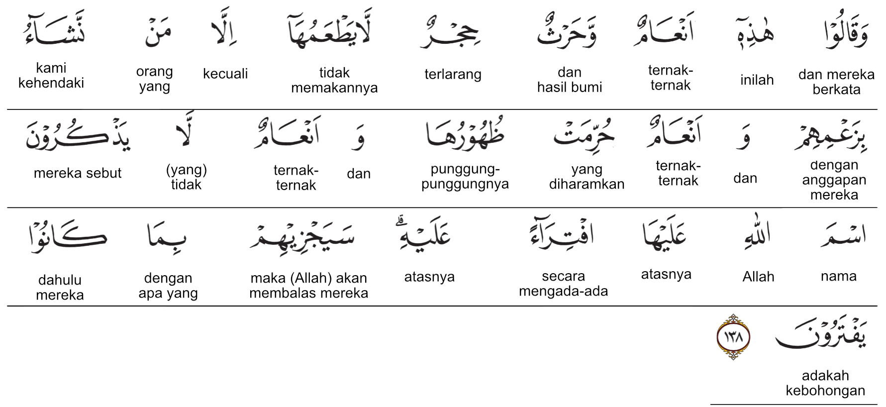 Kemenag RI 2019:Mereka berkata menurut anggapan mereka, “Inilah hewan ternak dan hasil bumi yang dilarang, tidak boleh dimakan, kecuali oleh orang yang kami kehendaki. Ada pula hewan yang diharamkan punggungnya (tidak boleh ditunggangi) dan ada hewan ternak yang (ketika disembelih) boleh tidak menyebut nama Allah.” (Hal itu) sebagai kebohongan terhadap Allah. Kelak Allah akan membalas semua yang mereka ada-adakan. Prof. Quraish Shihab:Dan (selain kesesatan yang lalu), mereka (juga) mengatakan: “Inilah binatang ternak dan tanaman yang dilarang, tidak boleh (ada yang) memakannya, kecuali siapa yang kami kehendaki (yaitu, para pelayan berhala),” menurut anggapan mereka (yang keliru). Dan (ada) binatang ternak yang diharamkan menungganginya dan binatang ternak yang mereka tidak menyebut nama Allah atasnya (sewaktu mereka sembelih, atau mereka kendarai untuk melaksanakan haji sambil mengumandangkan nama berhala-berhala mereka, bukan nama Allah swt.). (Ucapan itu) semata-mata kedustaan terhadap-Nya. Kelak Dia membalas mereka terhadap apa yang selalu mereka ada-adakan. Prof. HAMKA:Dan, mereka berkata, “Ini adalah binatang-binatang ternak dan ladang larangan yang seorang pun tidak boleh memakannya kecuali siapa-siapa yang kami kehendaki,” menurut pendakwaan dan beberapa binatang ternak yang diharamkan menungganginya dan beberapa binatang ternak yang tidak disebut nama Allah (ketika menyembelihnya) karena mengada-adakan atasnya. Maka Dia akan membalas kepada mereka dari apa yang telah mereka ada-adakan itu.