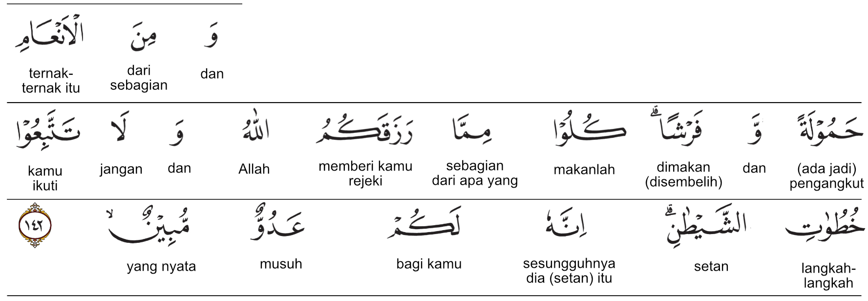 Kemenag RI 2019: Di antara hewan-hewan ternak itu ada yang dijadikan pengangkut beban dan ada (pula) yang untuk disembelih. Makanlah rezeki yang diberikan Allah kepadamu. Janganlah kamu mengikuti langkah-langkah setan. Sesungguhnya dia adalah musuh yang nyata bagimu.