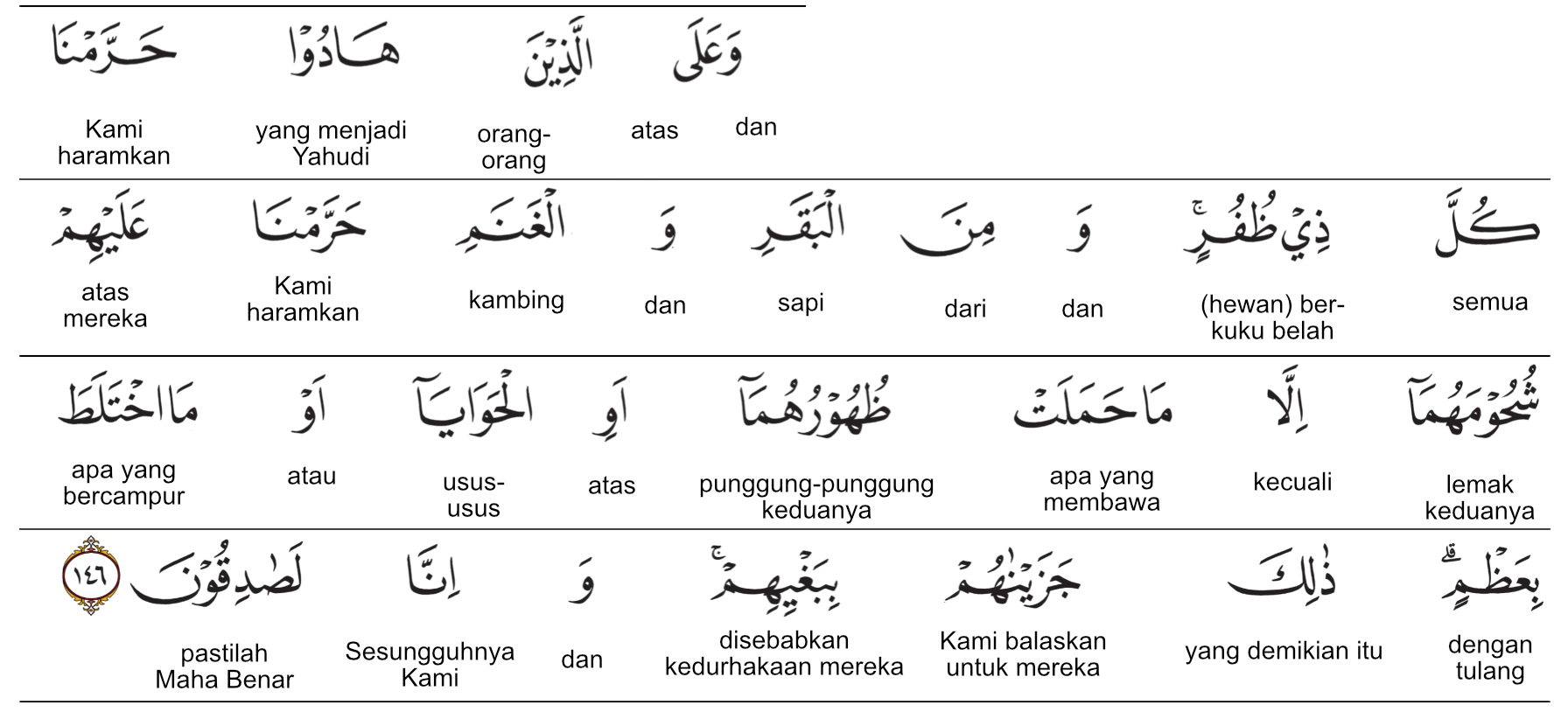 Kemenag RI 2019:Atas orang-orang Yahudi Kami mengharamkan semua (hewan) yang berkuku. ) Kami mengharamkan pula atas mereka lemak sapi dan domba, kecuali yang melekat di punggungnya, yang ada dalam isi perutnya, atau yang bercampur dengan tulang. Demikianlah Kami menghukum mereka karena kedurhakaannya. Sesungguhnya Kami Maha Benar. Prof. Quraish Shihab:Dan bagi orang-orang Yahudi, Kami haramkan segala binatang yang bergigi tajam. Dan bagi mereka ada yang Kami perintahkan (dalam Taurat) untuk mengharamkan sebagian makanan sebagaimana telah Kami jelaskan kepada mereka secara rinci. Dan bagi setiap orang yang zalim di antara mereka, sesungguhnya Kami akan menimpakan azab yang keras. Prof. HAMKA:Dan, atas orang-orang Yahudi telah Kami haramkan tiap-tiap yang mempunyai kuku, dan dari lembu dan kambing, telah Kami haramkan atas mereka lemaknya. Kecuali, lemak yang ada di punggung keduanya atau di dalam perut, atau apa yang tercampur dengan tulang. Demikian itulah, Kami balas mereka dengan sebab kejahatan mereka. Sesungguhnya Kami adalah benar.