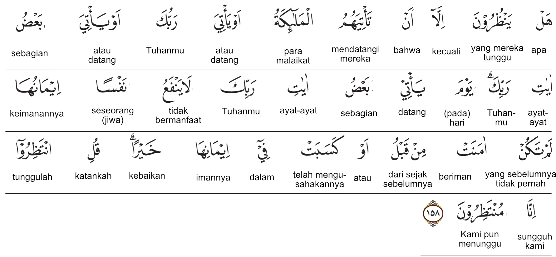 Kemenag RI 2019:Yang mereka nanti-nantikan hanyalah kedatangan malaikat kepada mereka, kedatangan Tuhanmu, atau sebagian tanda-tanda dari Tuhanmu. Pada hari datangnya sebagian tanda-tanda Tuhanmu tidak bermanfaat lagi iman seseorang yang belum beriman sebelum itu atau (belum) berusaha berbuat kebajikan dalam masa imannya itu. Katakanlah, “Tunggulah! Sesungguhnya Kami pun menunggu.” Prof. Quraish Shihab:Apakah mereka hanya menantikan kedatangan malaikat kepada mereka ataukah kedatangan Tuhan Pemeliharamu (supaya mereka melihat-Nya dengan mata kepala) atau kedatangan sebagian tanda-tanda (mukjizat yang bersifat inderawi dari) Tuhan Pemeliharamu. Pada hari datangnya sebagian tanda-tanda (dari) Tuhan Pemeliharamu, tidaklah bermanfaat (lagi) bagi diri seseorang imannya, yang belum beriman sebelum itu, atau dia (belum) mengusahakan kebaikan dalam masa imannya. Katakanlah: “Tunggulah, sesungguhnya kami (pun) menunggu.” Prof. HAMKA:Tidaklah yang mereka tunggu-tunggu, melainkan bahwa datang kepada mereka malaikat atau datang Tuhan engkau atau datang setengah dari ayat-ayat Tuhan engkau. Pada hari datang sebagian dari ayat-ayat Tuhan engkau itu, tidaklah akan memberi manfaat kepada suatu diri imannya, yang tidak beriman lebih dahulu atau dia berusaha pada imannya itu suatu kebaikan. Katakanlah, “Tunggulah olehmu sesungguhnya Kami pun menunggu.”