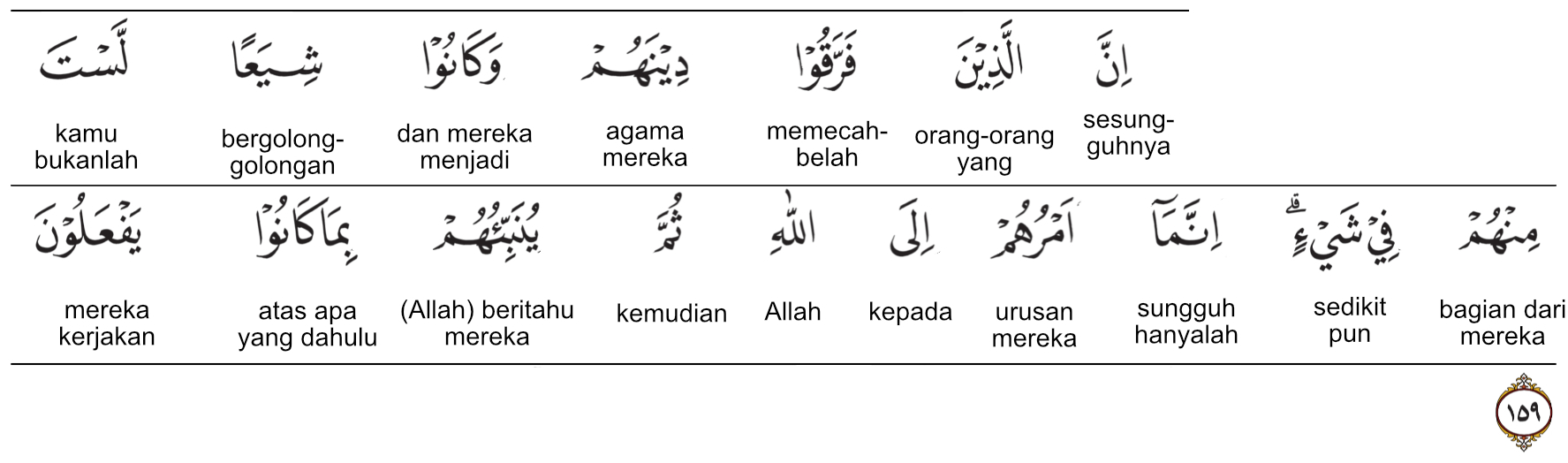 Kemenag RI 2019: Sesungguhnya orang-orang yang memecah belah agamanya dan mereka menjadi (terpecah) dalam golongan-golongan, sedikit pun engkau (Nabi Muhammad) tidak bertanggung jawab terhadap mereka. Sesungguhnya urusan mereka (terserah) hanya kepada Allah. Kemudian, Dia akan memberitahukan kepada mereka apa yang telah mereka perbuat.
