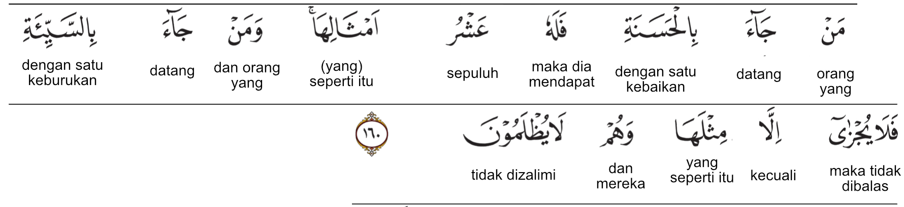 مَنْ جَاءَ بِالْحَسَنَةِ فَلَهُ عَشْرُ أَمْثَالِهَا ۖ وَمَنْ جَاءَ بِالسَّيِّئَةِ فَلَا يُجْزَىٰ إِلَّا مِثْلَهَا وَهُمْ لَا يُظْلَمُونَ