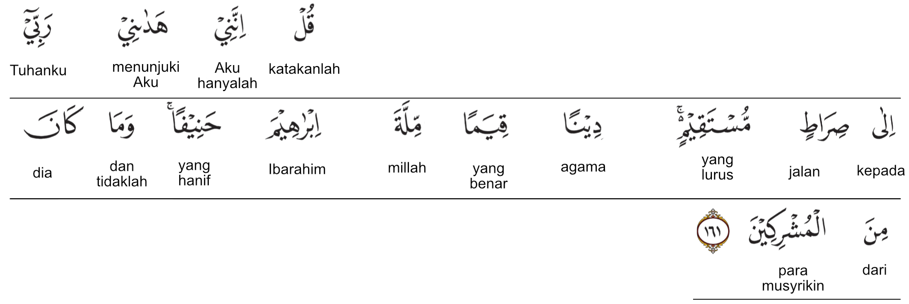 Kemenag RI 2019:Katakanlah (Nabi Muhammad), “Sesungguhnya Tuhanku telah membimbingku ke jalan yang lurus, agama yang benar, agama Ibrahim yang lurus, dan dia (Ibrahim) tidak termasuk orang-orang musyrik.” Prof. Quraish Shihab:Katakanlah (Nabi Muhammad saw); “Sesungguhnya aku telah dibimbing oleh Tuhan Pemeliharaku ke jalan lebar yang lurus, agama yang benar; agama Ibrahim yang biuuf (tidak cenderung kepada kebatilan dan jauh dari kepercayaan sesat), dan sekali-kali bukanlah dia (Nabi Ibrahim as.) termasuk (golongan) orang-orang musyrik.” Prof. HAMKA:Katakanlah, “Sesungguhnya aku telah diberi petunjuk akan daku oleh Tuhanku kepada jalan yang lurus. Agama yang teguh, agama Ibrahim yang jujur, dan tidaklah dia itu dari orang-orang musyrikin.”