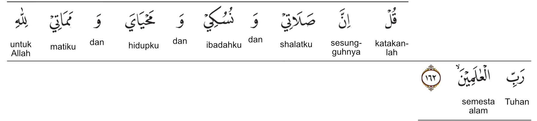 Kemenag RI 2019:Katakanlah (Nabi Muhammad), “Sesungguhnya salatku, ibadahku, hidupku, dan matiku hanyalah untuk Allah, Tuhan semesta alam. Prof. Quraish Shihab:Katakanlah (Nabi Muhammad saw): “Sesungguhnya shalatku, ibadahku dan hidup serta matiku hanyalah untuk Allah, Tuhan Pemelihara seluruh alam. Prof. HAMKA:Katakanlah, “Sesungguhnya shalatku, ibadahku, hidup dan matiku adalah karena Allah, Tuhan sarwa sekalian alam.”