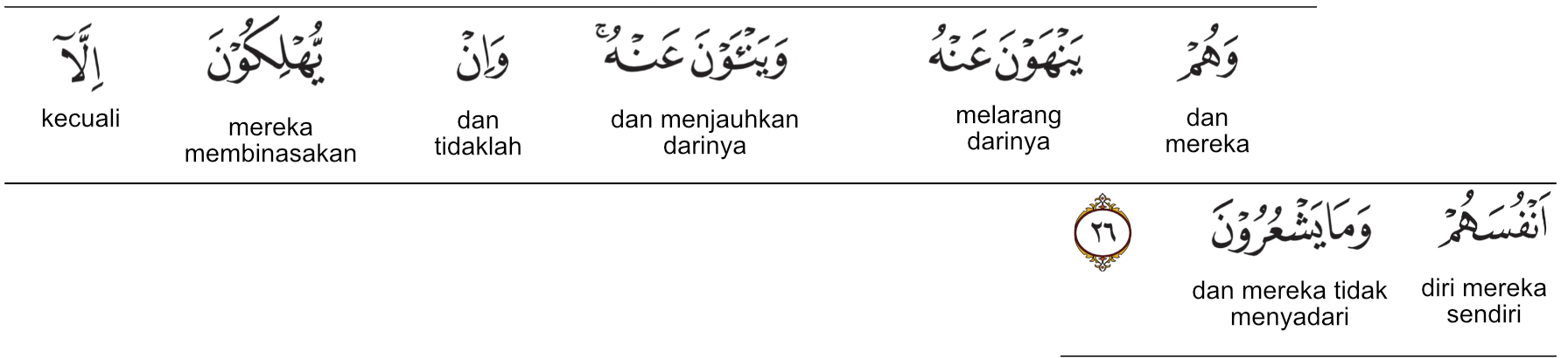 Kemenag RI 2019:Mereka melarang (orang lain) mendengarkannya (Al-Qur’an) dan mereka pun menjauhkan diri darinya. Mereka tidak membinasakan kecuali diri mereka sendiri, tetapi mereka tidak menyadari. Prof. Quraish Shihab:Mereka melarang (orang lain) mendengarkannya (al-Qur'an) dan mereka menjauhkan diri dari (tuntunan)-nya, dan mereka hanyalah membinasakan diri mereka sendiri, sedangkan mereka tidak menyadari. Prof. HAMKA:Dan mereka mencegah orang darinya dan mereka menjauh darinya. Dan tidaklah mereka membinasakan melainkan diri mereka sendiri sedangkan mereka tidak menyadarinya.