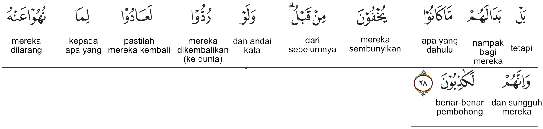 Kemenag RI 2019:Namun, (sebenarnya) kejahatan yang mereka selalu sembunyikan dahulu telah tampak bagi mereka. Seandainya dikembalikan (ke dunia), tentu mereka akan mengulang kembali apa yang telah dilarang mengerjakannya. Sesungguhnya mereka benar-benar para pendusta. Prof. Quraish Shihab:(Tidak demikian)! Bahkan sebenarnya telah nampak bagi mereka (azab yang tidak dapat mereka elakkan, sebagai akibat dari) apa yang dahulu selalu mereka sembunyikan. Dan jika seandainya mereka dikembalikan (ke dunia), tentulah mereka kembali kepada apa (kejahatan) yang mereka telah dilarang mengerjakannya, dan sesungguhnya mereka benar-benar para pembohong. Prof. HAMKA:Bahkan telah nyatalah bagi mereka apa yang mereka sembunyikan dahulunya. Tetapi jika sekiranya mereka dikembalikan pun niscaya mereka akan kembali (pula) kepada apa yang mereka telah dilarang daripadanya itu. Karena sesungguhnya mereka itu adalah pendusta.