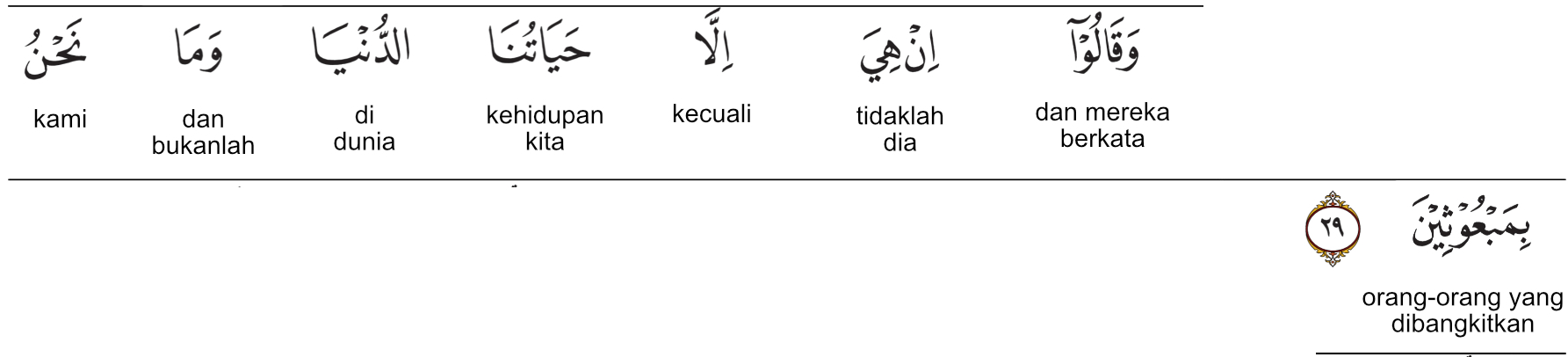 Maka penggalan (وَقَالُوا إِنْ هِيَ إِلَّا حَيَاتُنَا الدُّنْيَا) ini bermakna “Dan mereka berkata: tidak ada kehidupan selain kehidupan dunia kami ini.”