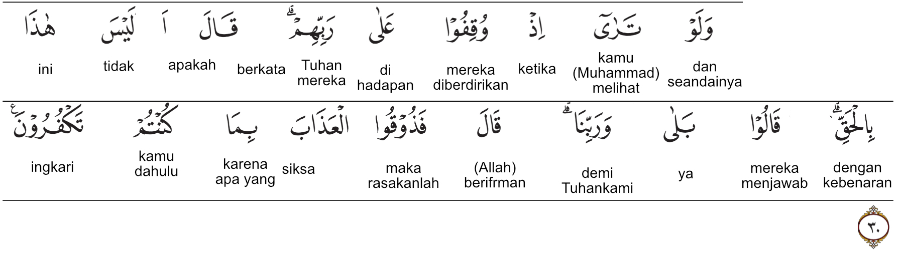 Kemenag RI 2019: Seandainya engkau (Nabi Muhammad) melihat ketika mereka dihadapkan kepada Tuhannya (tentulah engkau melihat peristiwa yang luar biasa). Dia berfirman, “Bukankah (kebangkitan) ini benar?” Mereka menjawab, “Sungguh benar, demi Tuhan kami.” Dia berfirman, “Rasakanlah azab ini karena kamu selalu kufur (kepadanya).”