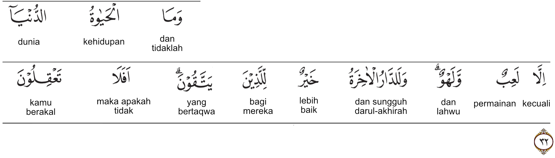 Ayat ke-32 dari surat Al-An’am ini merupakan pernyataan dari Allah SWT yang sangat mendalam isi pesannya, yaitu bahwa pada hakikatnya kehidupan di dunia ini semua tidak lain hanyalah sekedar permainan dan kelengahan semata. Inilah yang berlaku pada orang kafir.