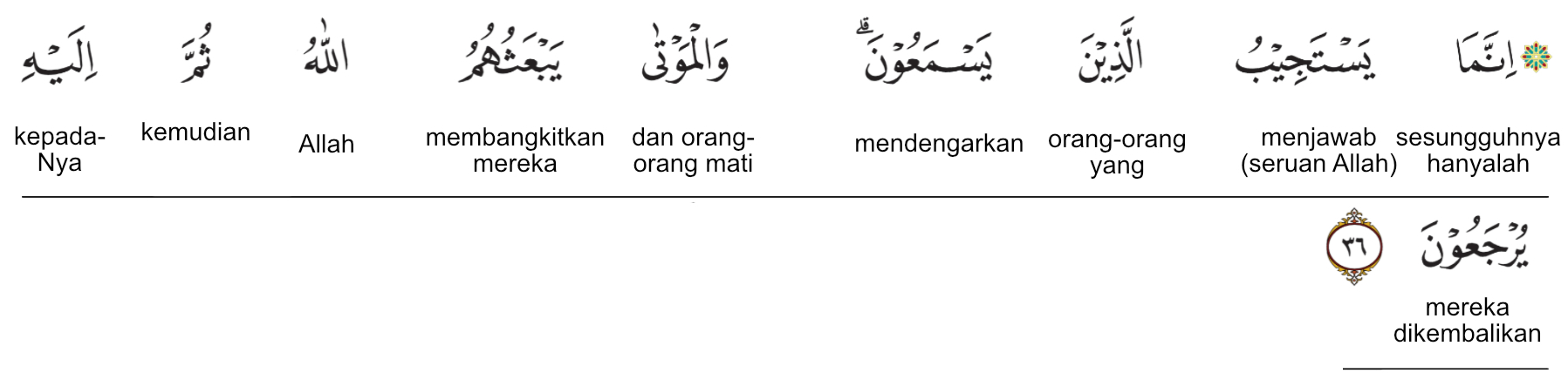 Kemenag RI 2019:Hanya orang-orang yang menyimak (ayat-ayat Allah) sajalah yang mematuhi (seruan-Nya). Adapun orang-orang yang mati ) kelak akan dibangkitkan oleh Allah, kemudian kepada-Nya mereka dikembalikan. Prof. Quraish Shihab:Sesungguhnya hanya orang-orang yang mendengar sajalah yang memperkenankan (seruan Allah swt.) dengan sungguh-sungguh, sedangkan orang-orang yang mati akan dibangkitkan oleh Allah, kemudian hanya kepada-Nya mereka akan dikembalikan. Prof. HAMKA:Hanya saja yang mau menyahut ialah orang-orang yang mendengar. Sedang orang-orang yang mati itu akan dibangkitkan mereka oleh Allah. Kemudian itu kepada-Nyalah mereka akan dikembalikan.