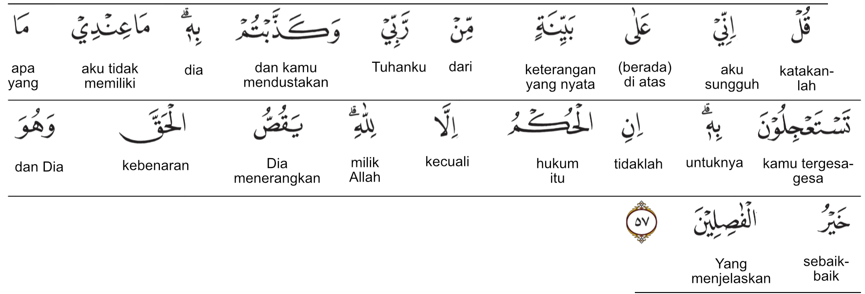 Kemenag RI 2019:Katakanlah (Nabi Muhammad), “Aku (berada) di atas keterangan yang nyata (kebenarannya, yaitu Al-Qur’an) dari Tuhanku, sedangkan kamu mendustakannya. Bukanlah kewenanganku (untuk menurunkan azab) yang kamu tuntut untuk disegerakan kedatangannya. Menetapkan hukum itu hanyalah hak Allah. Dia menerangkan kebenaran dan Dia pemberi keputusan yang terbaik.” Prof. Quraish Shihab:atakanlah (Nabi Muhammad saw.), “Sesungguhnya aku berada di atas sesuatu keterangan yang sangat nyata (kebenarannya, yaitu al-Qur’an) dari Tuhan Pemeliharaku, sedangkan kamu mendustakannya. Tidak terdapat di sisiku (wewenang untuk menurunkan) apa (siksa) yang kamu tuntut untuk disegerakan kedatangannya. Menetapkan hukum hanyalah hak (milik) Allah. Dia menjelaskan yang sebenarnya dan Dia-lah sebaik-baik Pemberi penjelasan.” Prof. HAMKA:Katakanlah, “Sesungguhnya aku adalah di atas keterangan yang nyata dari Tuhanku, tetapi kamu mendustakannya. Tidaklah ada kepadaku apa yang kamu harapkan cepat itu. Karena tidaklah ada hukum melainkan bagi Allah. Dialah yang akan menerangkan kebenaran dan Dialah yang sebaik-baik Pemutus.”