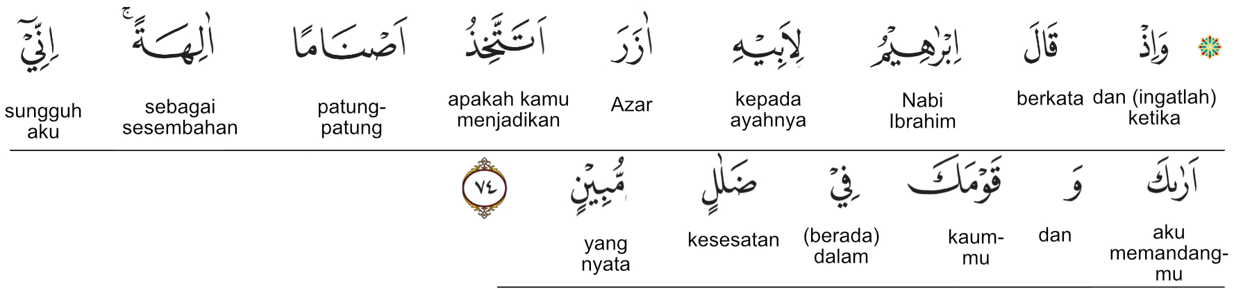 Kemenag RI 2019:(Ingatlah) ketika Ibrahim berkata kepada ayahnya, ) Azar, “Apakah (pantas) engkau menjadikan berhala-berhala itu sebagai tuhan? Sesungguhnya aku melihat engkau dan kaummu dalam kesesatan yang nyata.” Prof. Quraish Shihab:Dan (ingatlah) ketika Ibrahim berkata kepada bapaknya, Azar, “Pantaskah engkau menjadikan berhala-berhala sebagai sesembahan? Sesungguhnya aku melihat engkau dan kaummu dalam kesesatan yang nyata.” Prof. HAMKA:Dan (ingatlah) tatkala berkata Ibrahim kepada ayahnya Azar, "Adakah patut engkau anggap berhala-berhala itu sebagai tuhan-tuhan? Sesungguhnya aku lihat engkau dan kaum engkau adalah dalam kesesatan yang nyata."