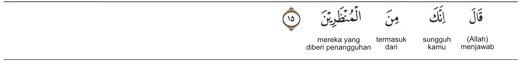 Kata qala (قَالَ) artinya : dia berkata, yaitu Allah SWT berfirman dalam rangka menjawab permohonan dari Iblis. Kata innaka (إِنَّكَ) artinya : sesungguhnya kamu. Kata minal munzharin (مِنَ الْمُنْظَرِينَ) artinya : termasuk dari mereka yang ditangguhkan.