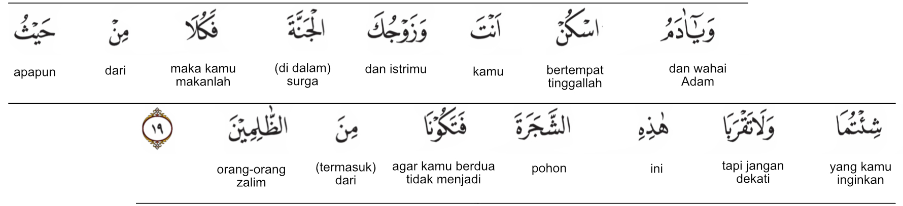 Kemenag RI 2019:(Allah berfirman,) “Wahai Adam, tinggallah engkau dan istrimu di surga (ini). Lalu, makanlah apa saja yang kamu berdua sukai dan janganlah kamu berdua mendekati pohon yang satu ini sehingga kamu berdua termasuk orang-orang yang zalim.” Prof. Quraish Shihab:Dan wahai Adam! Diamilah olehmu dan istrimu surga (ini), maka makanlah oleh kamu berdua di mana dan kapan saja kamu berdua kehendaki, dan janganlah kamu berdua mendekati pohon ini, sehingga menyebabkan kamu berdua termasuk orang-orang zalim.” Prof. HAMKA:Dan wahai Adam! Tinggallah engkau dan istri engkau di surga itu maka makanlah olehmu berdua mana-mana yang kamu sukai, tetapi janganlah kamu berdua mendekat kepada pohon ini, sebab kamu akan termasuk dari mereka yang zalim.