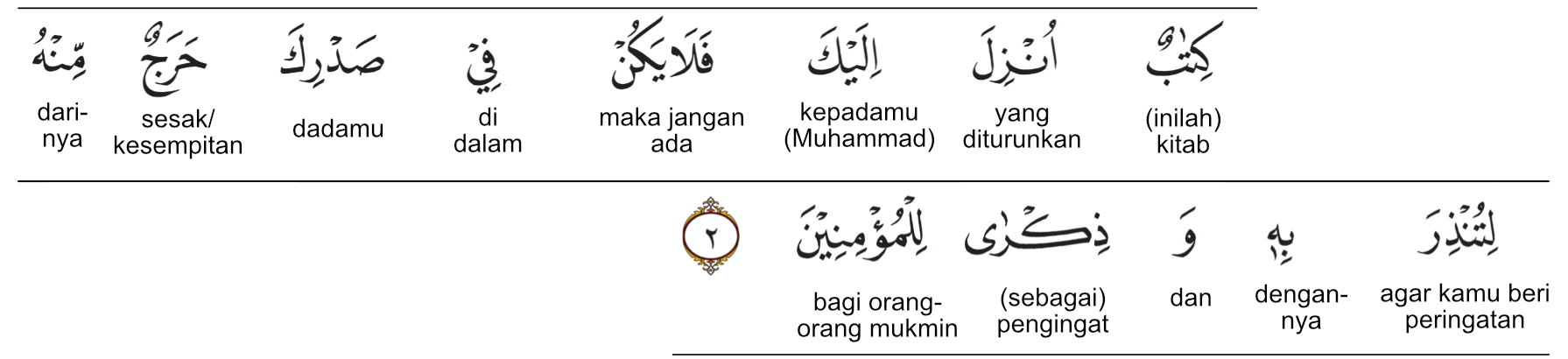 Kemenag RI 2019:(Inilah) Kitab yang diturunkan kepadamu (Nabi Muhammad), maka janganlah engkau sesak dada karenanya supaya dengan (kitab itu) engkau memberi peringatan, dan menjadi pelajaran bagi orang-orang yang beriman. Prof. Quraish Shihab:(Ini adalah) Kitab (al-Qur’an) yang diturunkan (oleh Allah swt.) kepadamu (Nabi Muhammad saw.), maka janganlah dalam dadamu ada kesempitan karenanya (yakni karena penolakan sementara orang terhadap al-Qur’an), supaya engkau memberi peringatan (kepada orang kafir) dengannya dan menjadi pengajaran bagi orang-orang mukmin. Prof. HAMKA:Suatu kitab yang telah diturunkan kepada engkau maka janganlah ada dalam dada engkau rasa sesak daripadanya supaya engkau ancamkan dengan dia dan peringatan bagi orang-orang yang beriman.