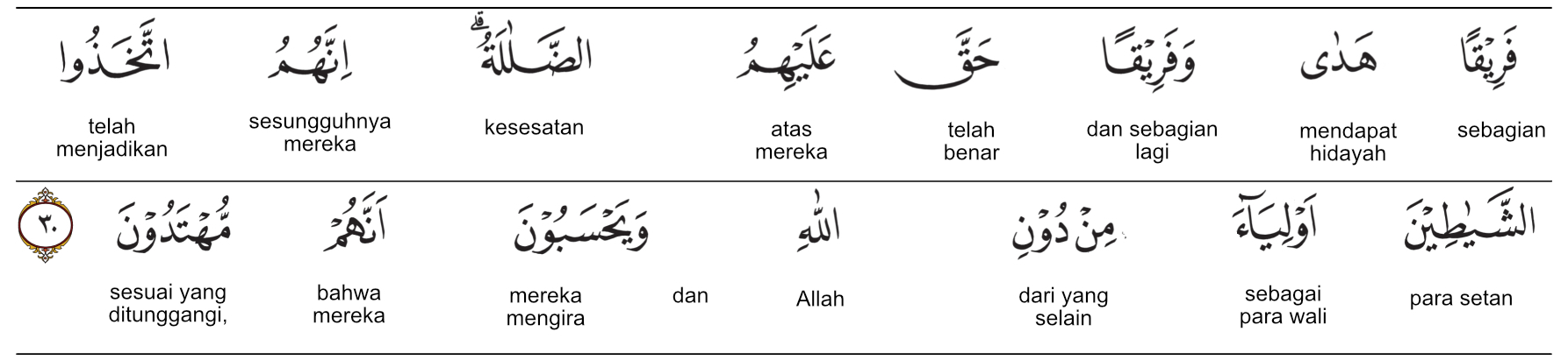 Kata wa fariqan (وَفَرِيقًا) artinya : dan sebagian yang lainnya. Kata haqqa ‘alaihim (حَقَّ عَلَيْهِمُ) adalah sebuah ungkapan yang juga menjadi satu idiom yang tidak bisa dimaknai secara terpisah. Maknanya adalah : telah ditetapkan, ditentukan, atau dengan gaya bahasa kita : telah ditakdirkan atas mereka.