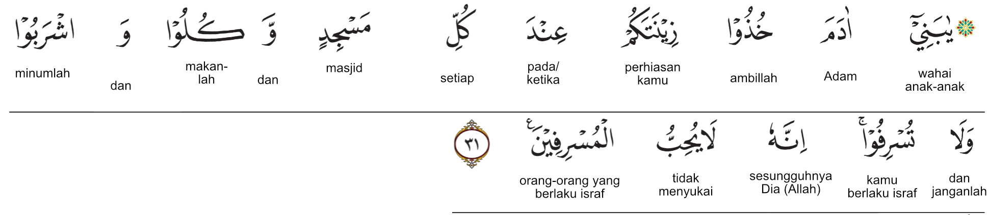 Kemenag RI 2019:Wahai anak cucu Adam, pakailah pakaianmu yang indah pada setiap (memasuki) masjid dan makan serta minumlah, tetapi janganlah berlebihan. Sesungguhnya Dia tidak menyukai orang-orang yang berlebihan. Prof. Quraish Shihab:Hai anak-cucu Adam! Pakailah pakaian kamu yang indah setiap (memasuki dan berada di) masjid, dan makan serta minumlah, dan janganlah berlebih-lebihan. Sesungguhnya Dia tidak menyukai orang-orang yang berlebih-lebihan (dalam segala hal). Prof. HAMKA:“Wahai anak-anak Adam, pakailah perhiasan kamu pada tiap-tiap masjid dan makanlah kamu dan minumlah, tetapi jangan berlebih-lebihan. Sesungguhnya Allah tidak suka kepada orang yang berlebih-lebihan.”