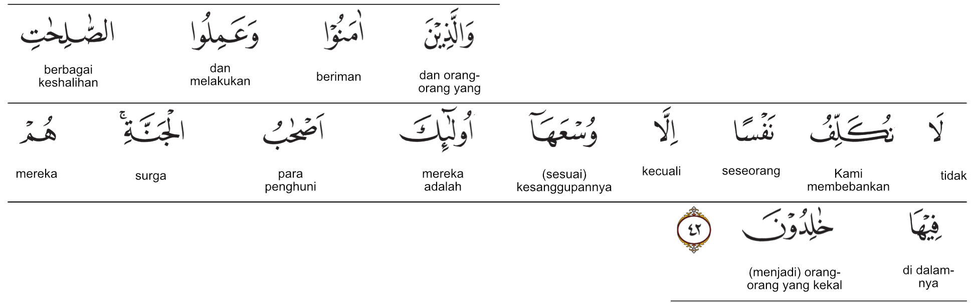 Prof. HAMKA: Dan orang-orang yang beriman dan beramal saleh, tidak Kami membebani suatu diri melainkan sekadar kesanggupannya. Adalah mereka itu penghuni surga. Mereka akan kekal di dalamnya.