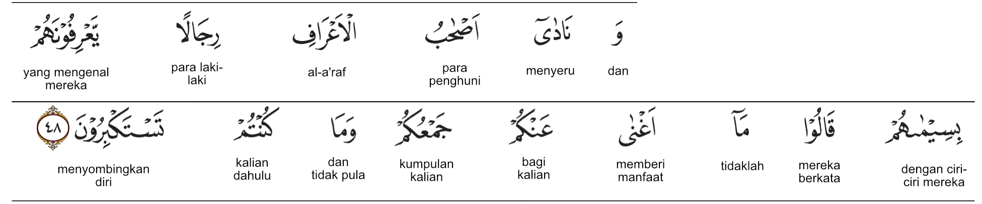 Kemenag RI 2019:Orang-orang di atas tempat yang tertinggi (al-a‘r?f) menyeru orang-orang yang mereka kenal dengan tanda-tanda (khusus) sambil berkata, “Tidak ada manfaatnya bagimu (harta) yang kamu kumpulkan dan apa yang selalu kamu sombongkan. Prof. Quraish Shihab:Dan mereka yang di atas A‘raf menyeru beberapa laki-laki (beberapa orang dari penghuni neraka) yang mereka mengenalnya dengan tanda-tanda (khusus) mereka, (dengan) mengatakan: “Tidak berguna untuk kamu apa yang kamu kumpulkan (di dunia berupa kekayaan atau kelompok) dan apa saja yang selalu kamu sombongkan. Prof. HAMKA:Dan menyeru penghuni benteng tinggi itu kepada orang-orang laki-laki yang mereka kenal dari tanda mereka masing-masing, mereka berkata, “Bukankah tidak berfaedah kepada kamu apa yang kamu kumpul-kumpulkan itu dan apa yang telah kamu besar-besarkan?”