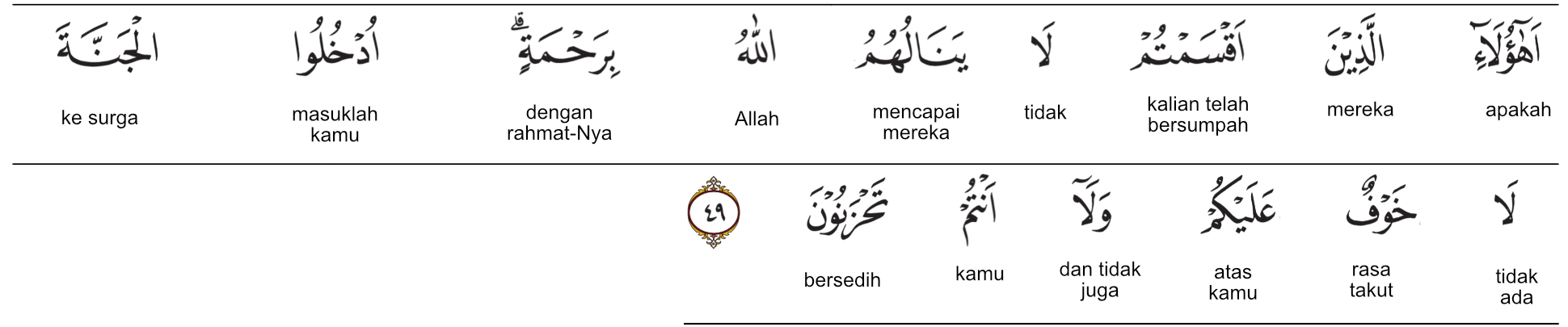 Kemenag RI 2019:Itukah orang-orang yang kamu telah bersumpah (ketika kamu hidup di dunia), bahwa mereka tidak akan diberi rahmat oleh Allah?” (Allah berfirman,) “Masuklah kamu ke dalam surga! Tidak ada rasa takut padamu dan kamu juga tidak akan bersedih.” Prof. Quraish Shihab:(Para penghuni surga) itukah orang-orang yang kamu telah bersumpah (ketika kamu hidup di dunia) bahwa mereka tidak akan diberi rahmat oleh Allah?” (Allah swt. berfirman): “Masuklah ke surga, tidak ada rasa takut menimpa kamu dan tidak (pula) kamu bersedih hati.” Prof. HAMKA:Apakah ini orang-orang yang pernah kamu sumpahkan bahwa tidaklah Allah akan mencapaikan rahmat kepada mereka, “Masuklah kamu ke dalam surga! Tidak ada ketakutan atas kamu dan tidaklah kamu akan berduka cita.”