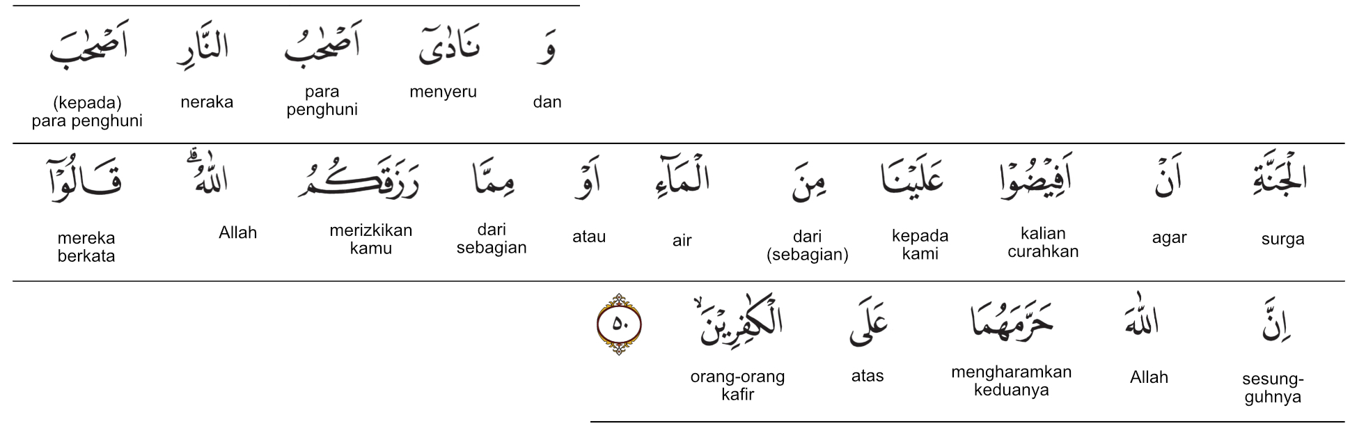 Kemenag RI 2019: Para penghuni neraka menyeru para penghuni surga, “Tuangkanlah (sedikit) air kepada kami atau rezeki apa saja yang telah dikaruniakan Allah kepadamu.” Mereka menjawab, “Sesungguhnya Allah telah mengharamkan keduanya (air dan rezeki) bagi orang-orang kafir.”