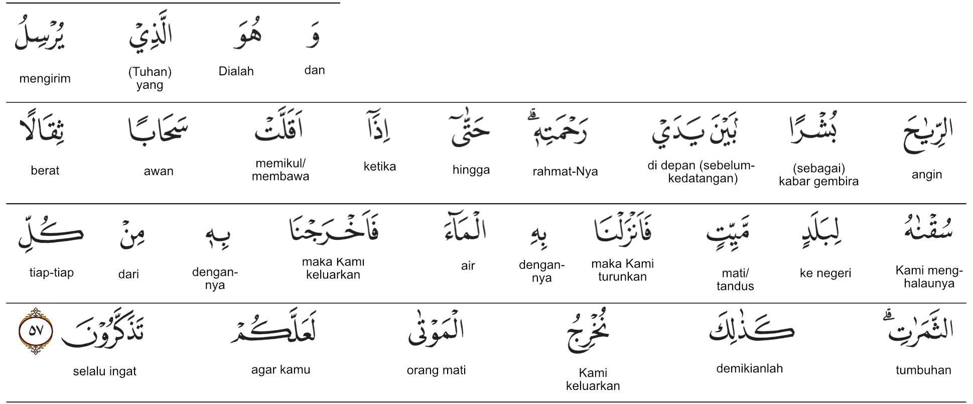 Kemenag RI 2019:Dialah yang mendatangkan angin sebagai kabar gembira yang mendahului kedatangan rahmat-Nya (hujan) sehingga apabila (angin itu) telah memikul awan yang berat, Kami halau ia ke suatu negeri yang mati (tandus), lalu Kami turunkan hujan di daerah itu. Kemudian Kami tumbuhkan dengan hujan itu berbagai macam buah-buahan. Seperti itulah Kami membangkitkan orang-orang mati agar kamu selalu ingat. Prof. Quraish Shihab:Dan Dia-lah yang mengirimkan aneka angin sebagai pembawa kabar gembira sebelum (kedatangan) rahmat-Nya (berupa hujan); sehingga apabila (aneka angin itu) telah memikul awan yang berat, Kami halau ia ke suatu negeri yang mati (tandus), lalu Kami turunkan hujan di sana, maka Kami keluarkan dengannya berbagai macam buah-buahan. Seperti itulah Kami membangkitkan orang-orang yang telah mati, supaya kamu selalu ingat (mengambil pelajaran darinya). Prof. HAMKA:Dan Dialah yang mengirim berbagai angin sebagai pembawa berita gembira di hadapan rahmat-Nya sehingga apabila dia telah membawa mega yang berat, Kami tariklah dia ke negeri yang mati dan Kami turunkanlah dengan dia air. Maka, Kami keluarkanlah dengan (air) itu tiap-tiap tumbuh-tumbuhan. Demikian pulalah akan Kami hidupkan orang yang telah mati supaya kamu mau ingat.