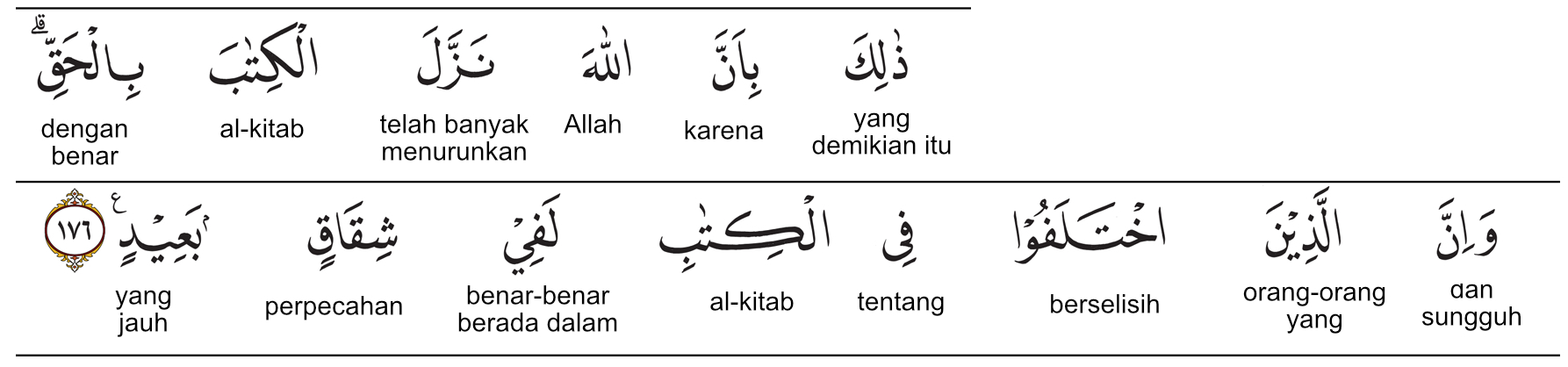 Kemenag RI 2019: Yang demikian itu disebabkan Allah telah menurunkan kitab suci dengan hak. Sesungguhnya orang-orang yang berselisih paham tentang (kebenaran) kitab suci itu benar-benar dalam perpecahan yang jauh.