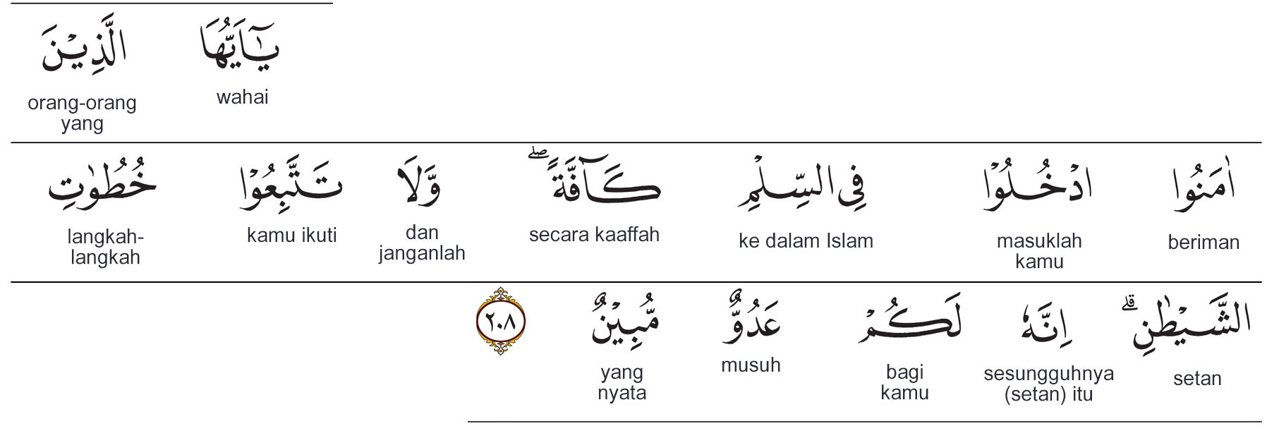 Kemenag RI 2019: Wahai orang-orang yang beriman, masuklah ke dalam Islam (kedamaian) secara menyeluruh dan janganlah ikuti langkah-langkah setan! Sesungguhnya ia adalah musuh yang nyata bagimu.