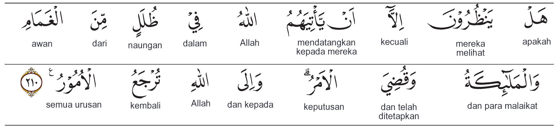Kemenag RI 2019:Tidak ada yang mereka tunggu-tunggu (pada hari Kiamat), kecuali kedatangan Allah dalam naungan awan bersama malaikat (untuk melakukan perhitungan), sedangkan perkara (mereka) telah diputuskan. Kepada Allahlah segala perkara dikembalikan. Prof. Quraish Shihab:Apakah yang mereka nantikan hanya Allah yang datang bersama para malaikat (pada Hari Kiamat) dalam naungan awan? (Jelas bukan itu yang mereka nantikan j. Dan putuskanlah urusan. Dan hanya kepada Allah dikembalikan semua urusan. Prof. HAMKA:Tiadalah yang mereka tunggu kecuali bahwa datang kepada mereka itu (siksa) Allah di dalam gumpalan awan bersama Malaikat, padahal perkara telah diputuskan dan kepada Allah akan kembali segala perkara.