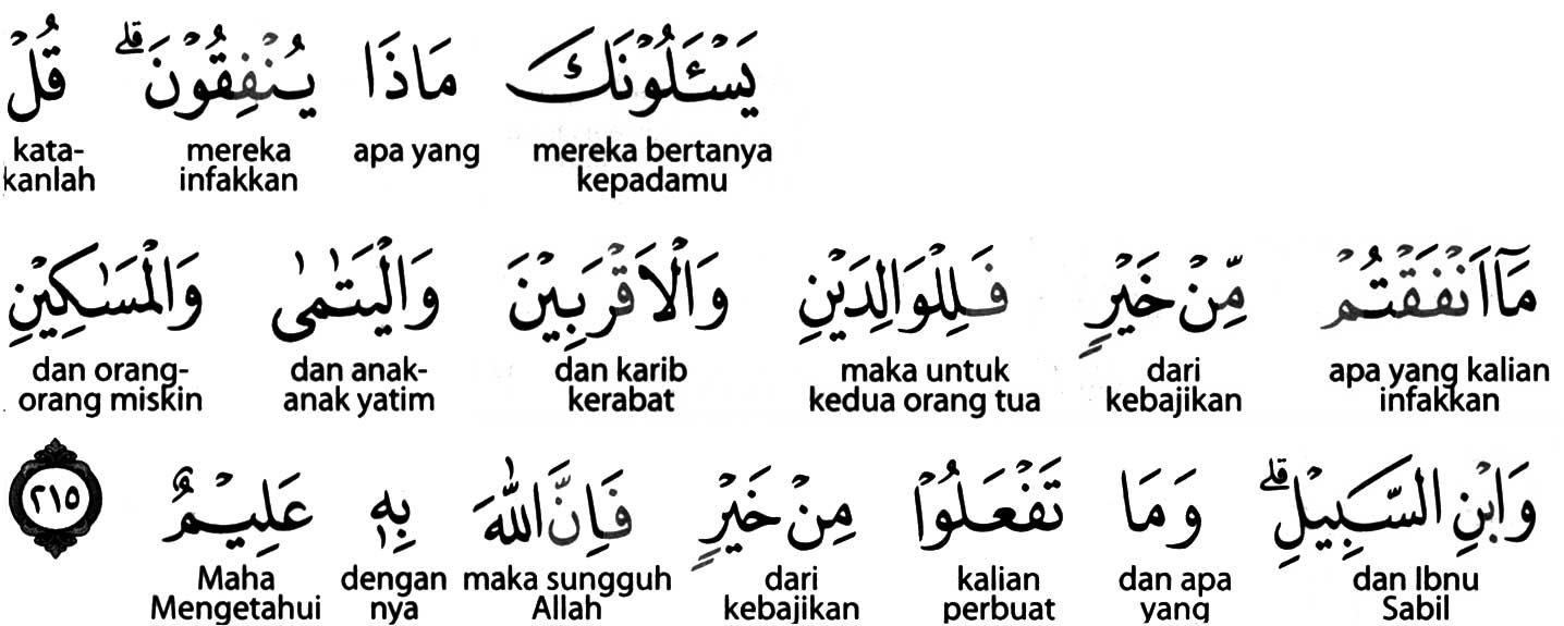 Kemenag RI 2019: Mereka bertanya kepadamu (Nabi Muhammad) tentang apa yang harus mereka infakkan. Katakanlah, “Harta apa saja yang kamu infakkan, hendaknya diperuntukkan bagi kedua orang tua, kerabat, anak-anak yatim, orang-orang miskin, dan orang yang dalam perjalanan (dan membutuhkan pertolongan).” Kebaikan apa saja yang kamu kerjakan, sesungguhnya Allah Maha Mengetahuinya.