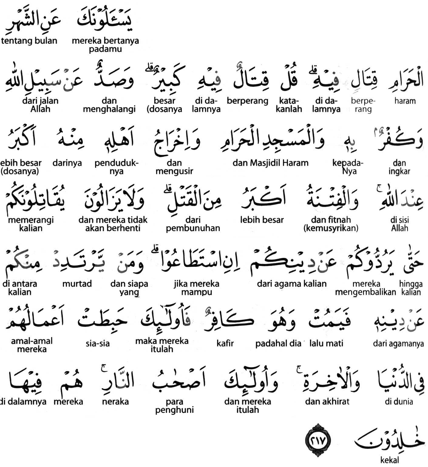 Kemenag RI 2019: Mereka bertanya kepadamu (Nabi Muhammad) tentang berperang pada bulan haram. Katakanlah, “Berperang dalam bulan itu adalah (dosa) besar. Namun, menghalangi (orang) dari jalan Allah, ingkar kepada-Nya, (menghalangi orang masuk) Masjidilharam, dan mengusir penduduk dari sekitarnya, lebih besar (dosanya) dalam pandangan Allah. Fitnah (pemusyrikan dan penindasan) lebih kejam daripada pembunuhan.” Mereka tidak akan berhenti memerangi kamu sampai kamu murtad (keluar) dari agamamu jika mereka sanggup. Siapa di antara kamu yang murtad dari agamanya lalu dia mati dalam kekafiran, sia-sialah amal mereka di dunia dan akhirat. Mereka itulah penghuni neraka. Mereka kekal di dalamnya.