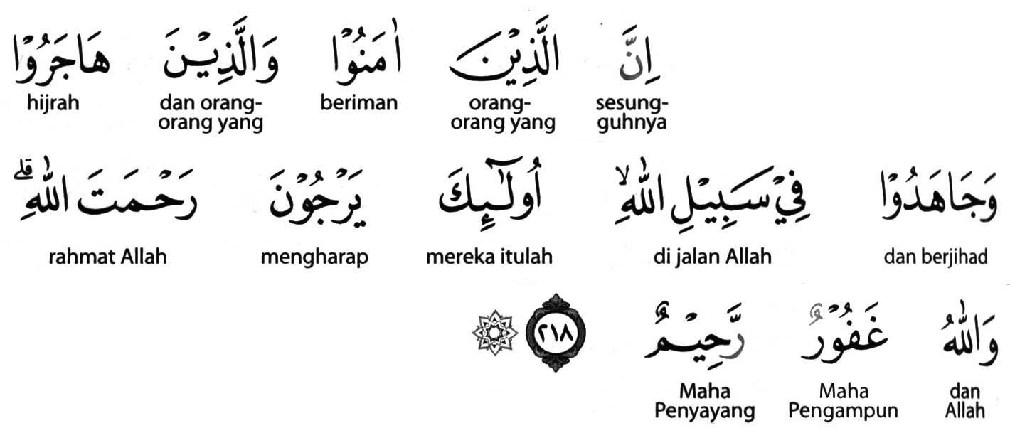 Kemenag RI 2019:Sesungguhnya orang-orang yang beriman serta orang-orang yang berhijrah dan berjihad ) di jalan Allah, mereka itu mengharapkan rahmat Allah. Allah Maha Pengampun lagi Maha Penyayang. Prof. Quraish Shihab:Sesungguhnya orang-orang yang beriman, orang-orang yang berhijrah dan berjihad` di jalan .Allah, mereka itu mengharapkan rahmat Allah, dan Allah Maha Pengampun, lagi Maha Pengasih. Prof. HAMKA:Sesungguhnya, orang-orang yang beriman dan orang-orang yang berhijrah dan berjuang pada jalan Allah, itulah orang-orang yang mengharapkan rahmat Allah. Sedang Allah adalah Maha Pengampun lagi Penyayang.