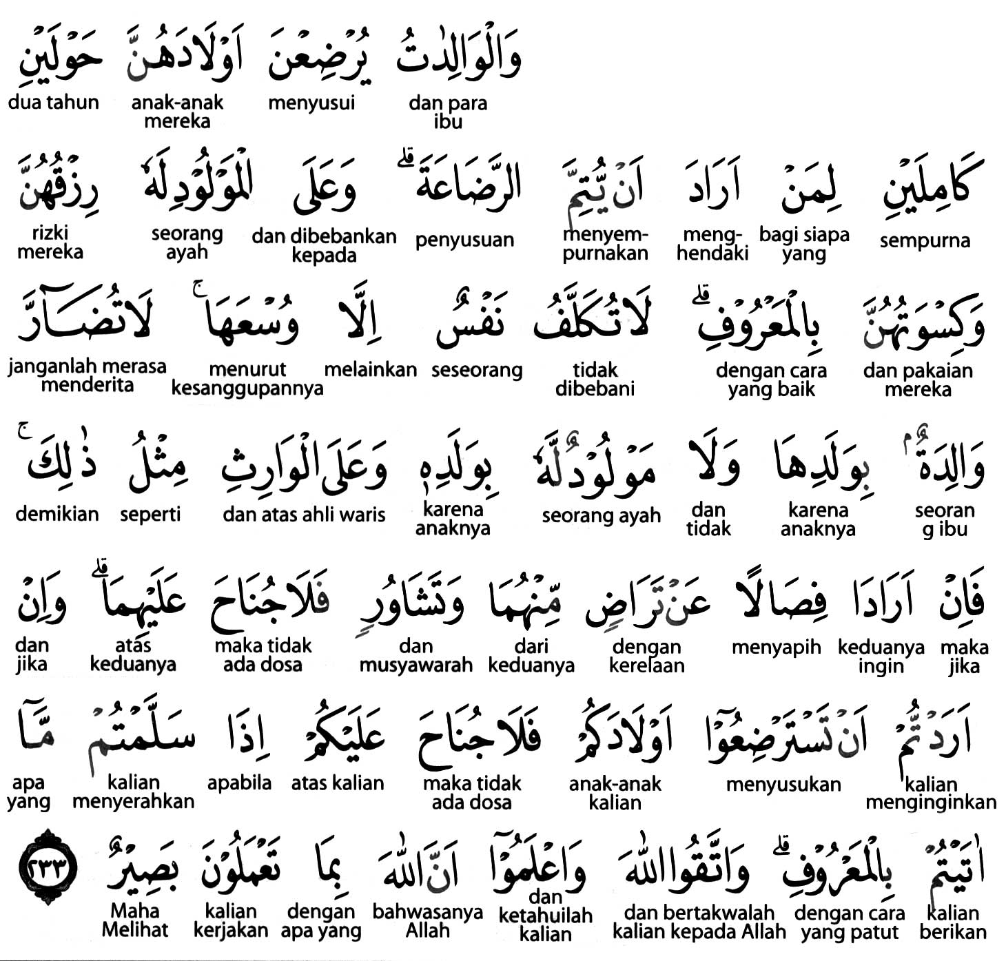 Kemenag RI 2019: Ibu-ibu hendaklah menyusui anak-anaknya selama dua tahun penuh, bagi yang ingin menyempurnakan penyusuan. Kewajiban ayah menanggung makan dan pakaian mereka dengan cara yang patut. Seseorang tidak dibebani, kecuali sesuai dengan kemampuannya. Janganlah seorang ibu dibuat menderita karena anaknya dan jangan pula ayahnya dibuat menderita karena anaknya. Ahli waris pun seperti itu pula. Apabila keduanya ingin menyapih (sebelum dua tahun) berdasarkan persetujuan dan musyawarah antara keduanya, tidak ada dosa atas keduanya. Apabila kamu ingin menyusukan anakmu (kepada orang lain), tidak ada dosa bagimu jika kamu memberikan pembayaran dengan cara yang patut. Bertakwalah kepada Allah dan ketahuilah bahwa sesungguhnya Allah Maha Melihat apa yang kamu kerjakan.
