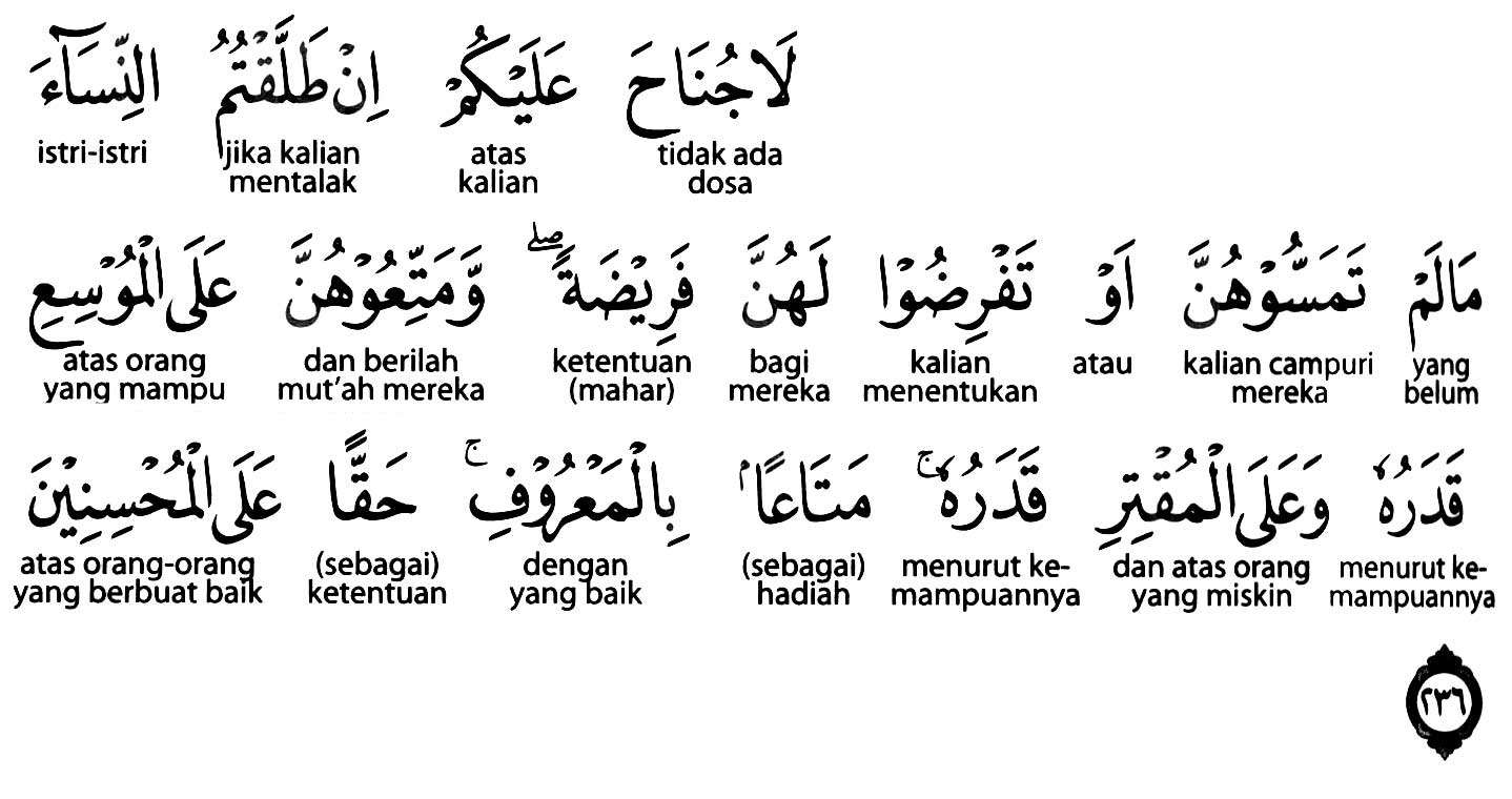 Kemenag RI 2019:Tidak ada dosa bagimu (untuk tidak membayar mahar) jika kamu menceraikan istri-istrimu yang belum kamu sentuh (campuri) atau belum kamu tentukan maharnya. Berilah mereka mut‘ah, ) bagi yang kaya sesuai dengan kemampuannya dan bagi yang miskin sesuai dengan kemampuannya pula, sebagai pemberian dengan cara yang patut dan ketentuan bagi orang-orang yang berbuat ihsan. Prof. Quraish Shihab:Tidak ada kewajiban atas kamu (membayar mahar) jika kamu menceraikan istri-istri (kamu) selama kamu belum menyentuh (mencampuri) mereka atau mewajibkan (atas diri kamu) untuk mereka satu kewajiban (membayar mahar). Dan hendaklah kamu berikan (suatu) pemberian kepada mereka. Orang yang luas (rezekinya) menurut kemampuannya dan orang yang miskin menurut kemampuannya (pula), yaitu pemberian menurut cara yang patut. Yang demikian itu merupakan hak (ketentuan) atas orang-orang muhsin (orang yang selalu berbuat yang lebih baik). Prof. HAMKA:Tidaklah ada halangan atas kamu jika kamu menalak perempuan, selama tidak kamu sentuh mereka, atau sebelum kamu tentukan kepada mereka (mahar) yang difardhukan dan berilah mereka bekal; (yaitu) bagi orang yang berkelapangan sekadar (lapangnya), dan bagi yang berkesempitan menurut kadamya (pula), yaitu bekalan yang sepatutnya. Menjadi kewajiban bagi orang-orang yang ingin berbuat kebaikan.