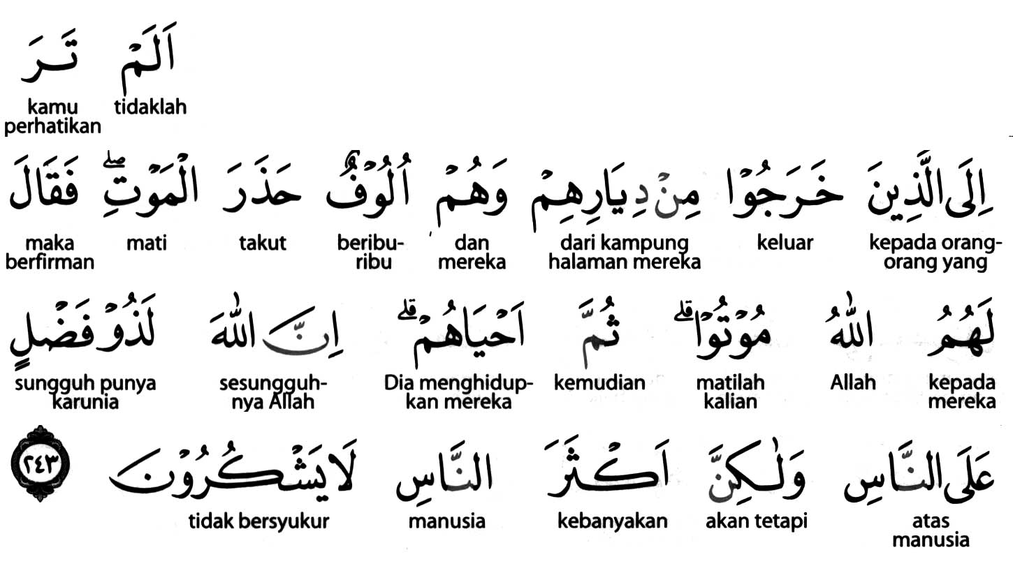 Kemenag RI 2019:Tidakkah kamu memperhatikan orang-orang yang keluar dari kampung halamannya dalam jumlah ribuan karena takut mati? Lalu, Allah berfirman kepada mereka, “Matilah kamu!” Kemudian, Allah menghidupkan mereka. Sesungguhnya Allah Pemberi karunia kepada manusia, tetapi kebanyakan manusia tidak bersyukur. Prof. Quraish Shihab:Tidakkah kamu memperhatikan orang-orang yang keluar dari kampung halaman mereka, sedangkan mereka beribu-ribu (jumlahnya) karena takut mati; maka Allah berfirman kepada mereka: “Matilah kamu (semua),” kemudian Dia menghidupkan mereka. Sesungguhnya Allah benar-benar memiliki karunia (yang dilimpahkan-Nya) atas manusia, tetapi kebanyakan manusia tidak bersyukur. Prof. HAMKA:Atau tidakkah engkau perhatikan orangorang yang keluar dari kampung-kampung mereka, pad a ha I mereka beribu-ribu, karena takut mati? Maka berkatalah Allah kepada mereka, "Matilah kamu semuanya!" Kemudian Dia hidupkan mereka. Sesungguhnya, Allah adalah mempunyai karunia atas manusia, akan tetapi kebanyakan manusia tidaklah bersyukur.