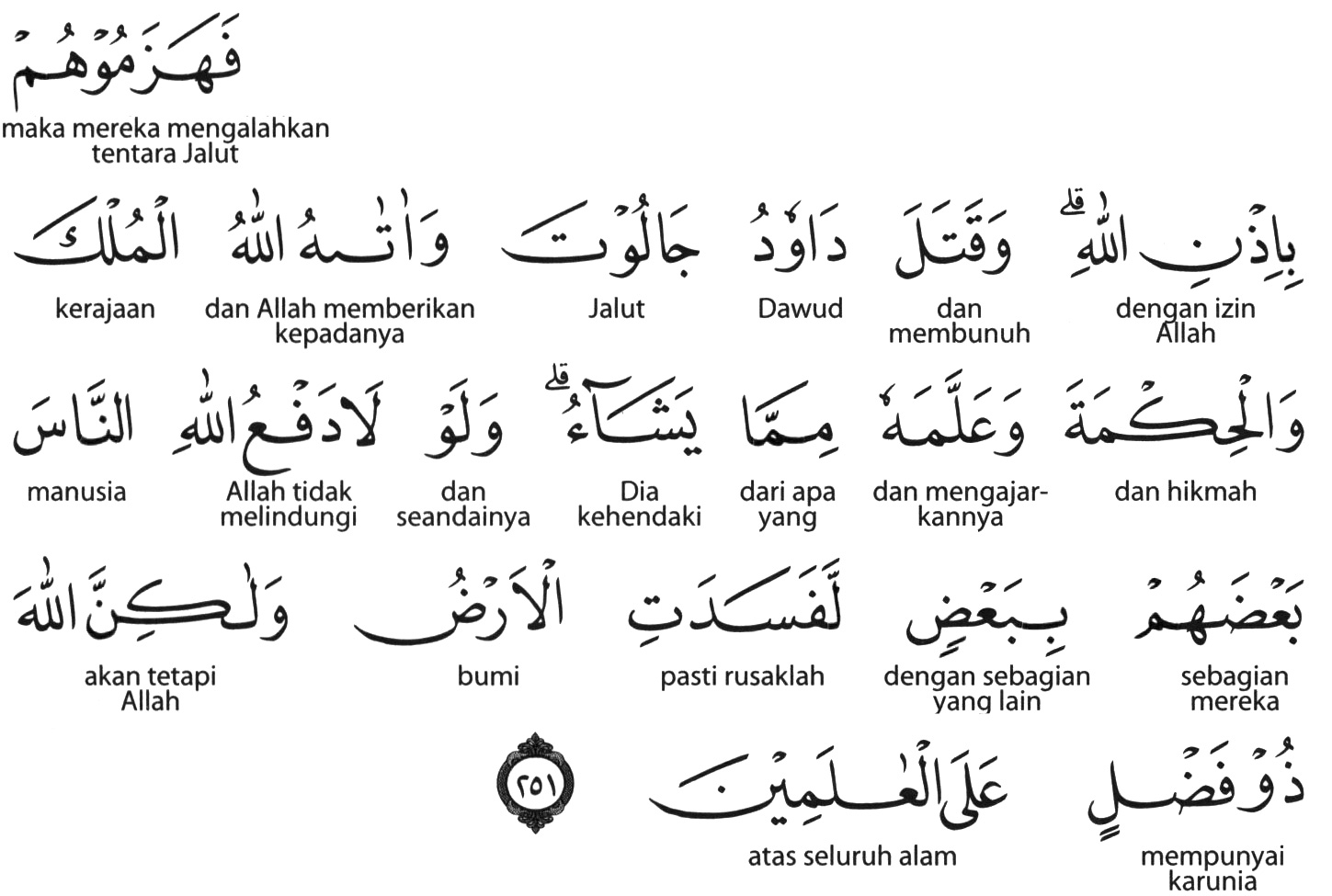 فَهَزَمُوهُمْ بِإِذْنِ اللَّهِ وَقَتَلَ دَاوُودُ جَالُوتَ وَآتَاهُ اللَّهُ الْمُلْكَ وَالْحِكْمَةَ وَعَلَّمَهُ مِمَّا يَشَاءُ ۗ وَلَوْلَا دَفْعُ اللَّهِ النَّاسَ بَعْضَهُمْ بِبَعْضٍ لَفَسَدَتِ الْأَرْضُ وَلَٰكِنَّ اللَّهَ ذُو فَضْلٍ عَلَى الْعَالَمِينَ