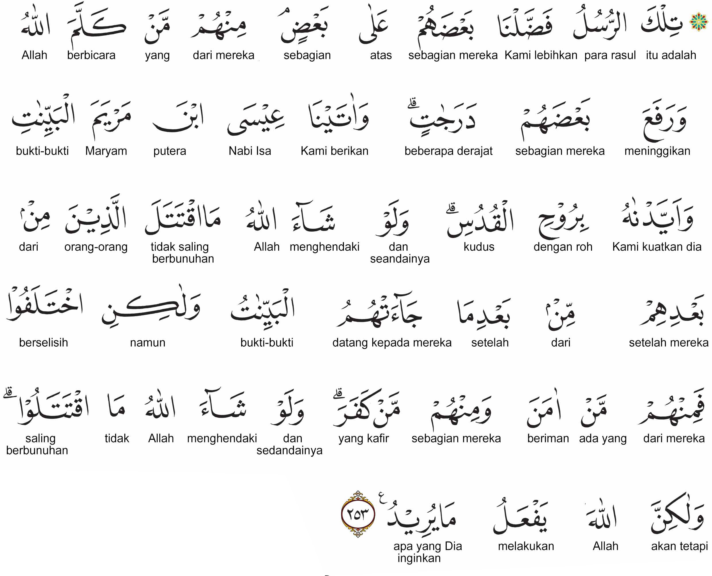Kemenag RI 2019: Para rasul itu Kami lebihkan sebagian mereka atas sebagian (yang lain). Di antara mereka ada yang Allah berbicara (langsung) dengannya dan sebagian lagi Dia tinggikan beberapa derajat. Kami telah menganugerahkan kepada Isa putra Maryam bukti-bukti yang sangat jelas (mukjizat) dan Kami memperkuat dia dengan Ruhulkudus (Jibril). Seandainya Allah menghendaki, niscaya orang-orang setelah mereka tidak akan saling membunuh setelah bukti-bukti sampai kepada mereka. Akan tetapi, mereka berselisih sehingga ada di antara mereka yang beriman dan ada (pula) yang kufur. Andaikata Allah menghendaki, tidaklah mereka saling membunuh. Namun, Allah melakukan apa yang Dia kehendaki.Para rasul itu Kami lebihkan sebagian (dari) mereka atas sebagian (yang lain). Di antara mereka ada yang Allah berkata-kata (langsung dengan dia) dan sebagian dari mereka Dia meninggikannya (beberapa) derajat. Dan Kami telah menganugerahkan kepada ‘Isa putra Maryam bukti-bukti yang sangat jelas (mukjizat) serta Kami kukuhkan dia dengan Ruhul Qudus (Malaikat Jibril as.) Dan jika seandainya Allah menghendaki, (pasti) tidaklah saling membunuh orang-orang yang (datang) sesudah mereka (para rasul itu), setelah datang kepada mereka bukti-bukti yang sangat jelas (itu), tetapi mereka berselisih. Maka, ada di antara mereka yang beriman dan ada (pula) di antara mereka yang kafir. Dan jika seandainya Allah menghendaki, tidaklah mereka saling membunuh, tetapi Allah berbuat apa yang dikehendaki-Nya.