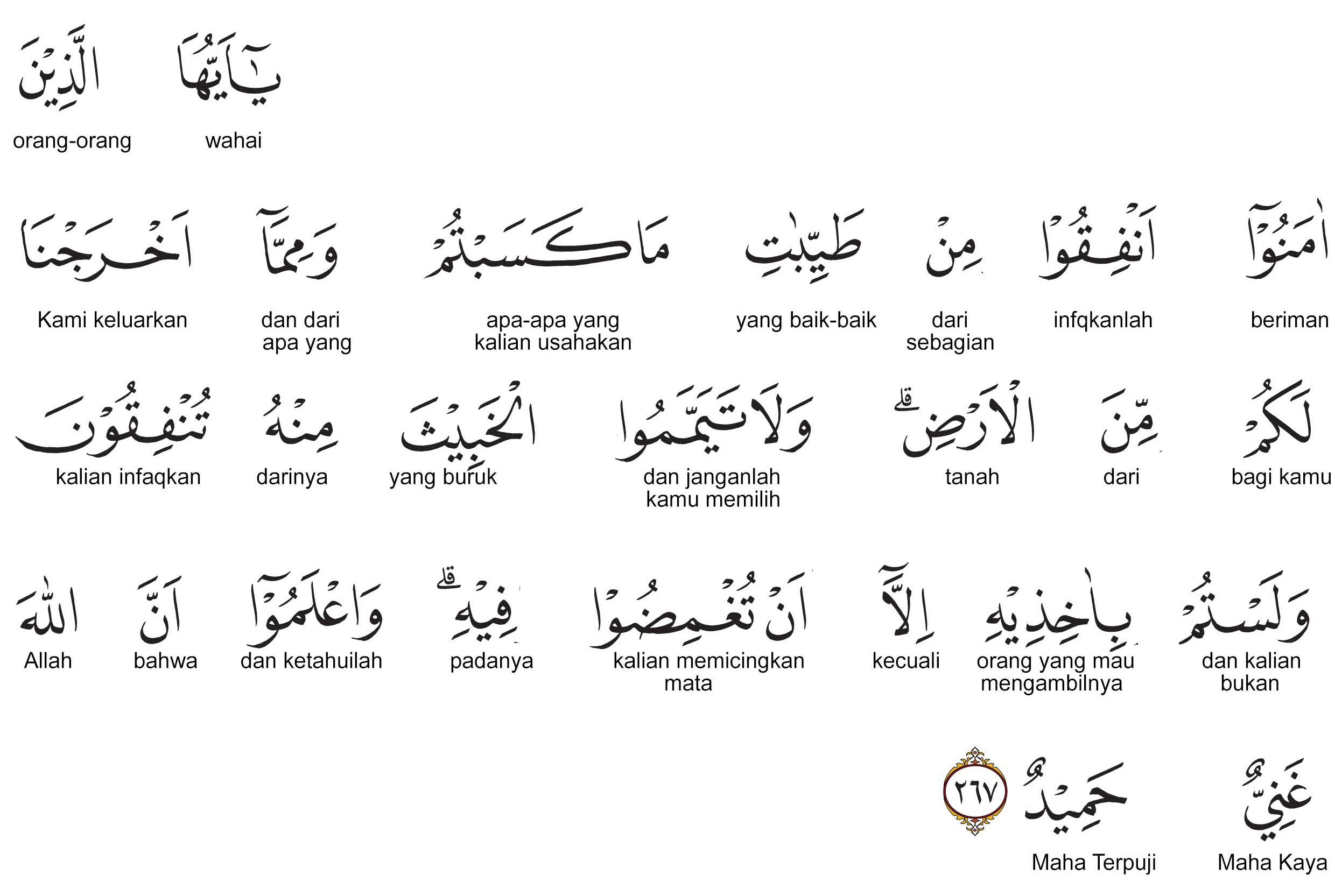 Kemenag RI 2019:Wahai orang-orang yang beriman, infakkanlah sebagian dari hasil usahamu yang baik-baik dan sebagian dari apa yang Kami keluarkan dari bumi untukmu. Janganlah kamu memilih yang buruk untuk kamu infakkan, padahal kamu tidak mau mengambilnya, kecuali dengan memicingkan mata (enggan) terhadapnya. Ketahuilah bahwa Allah Maha Kaya lagi Maha Terpuji. Prof. Quraish Shihab:Hai orang-orang yang beriman! Nafkahkanlah yang baik-baik sebagian dari hasil usaha kamu dan sebagian dari apa yang Kami keluarkan dari bumi untuk kamu. Dan janganlah kamu memilih yang buruk-buruk, lalu kamu nafkahkan darinya, padahal kamu (sendiri) tidak mau mengambilnya melainkan dengan memicingkan mata terhadapnya. Dan ketahuilah bahwa Allah Maha Kaya, lagi Maha Terpuji. Prof. HAMKA:Wahai, orang-orang yang beriman! Belanjakan sebagian dari hasil-hasil usaha kamu yang baik-baik, dan dari apa yang telah Kami keluarkan untuk kamu dari bumi, dan janganlah kamu pilih pilih yang buruk darinya, lalu kamu belanjakan, dan kamu pun tidaklah akan menerimanya melainkan dengan memejamkan mata kamu. Dan, ketahuilah, sesungguhnya Allah Mahakaya lagi Terpuji.