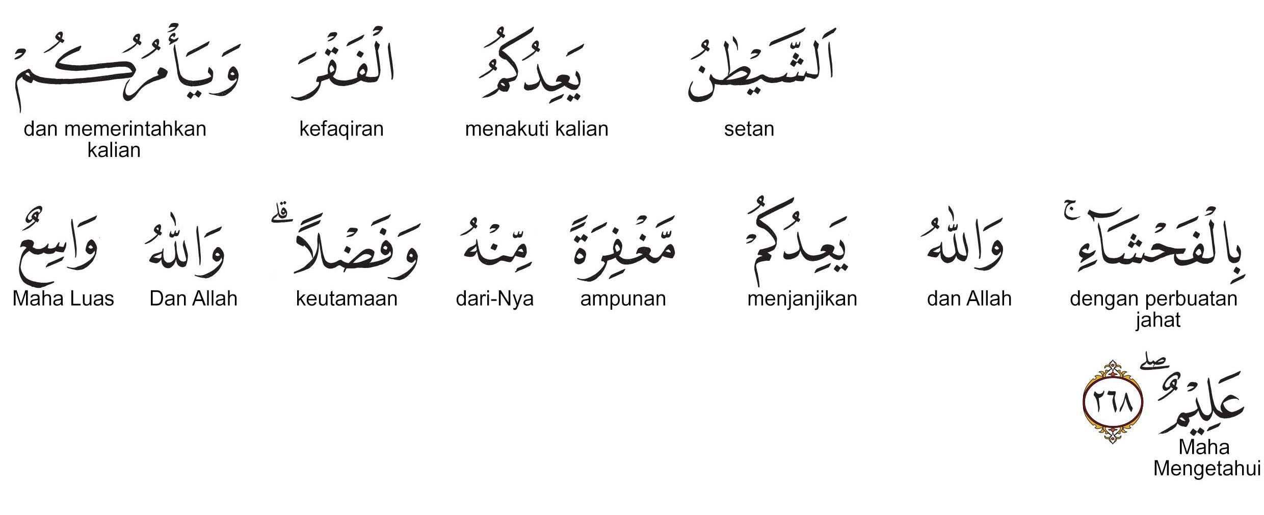 Ayat ke-268 ini seperti sambungan langsung dari ayat sebelumnya. Kalau di ayat sebelumnya Allah SWT melarang berinfaq dengan harta yang tidak baik dalam arti yang kualitasnya rendah, sampai kita memicingkan mata karena memang tidak berharga, maka di ayat ini dijelaskan lebih lanjut kenapa sampai ada orang yang berinfaq dengan harta yang kurang berkualitas. Ternyata sumbernya adalah isu yang ditiupkan oleh setan ke dalam hati manusia, sehingga dia merasa akan jatuh miskin bisa berinfaq dengan yang bernilai tinggi.