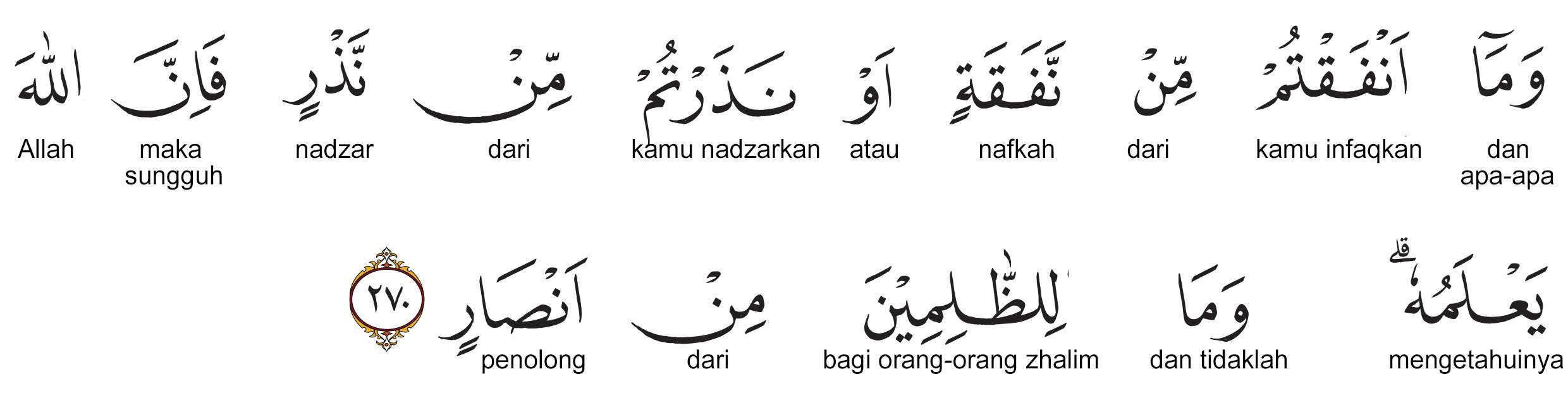 Kemenag RI 2019: Infak apa pun yang kamu berikan atau nazar apa pun yang kamu janjikan sesungguhnya Allah mengetahuinya. Bagi orang-orang zalim tidak ada satu pun penolong (dari azab Allah).