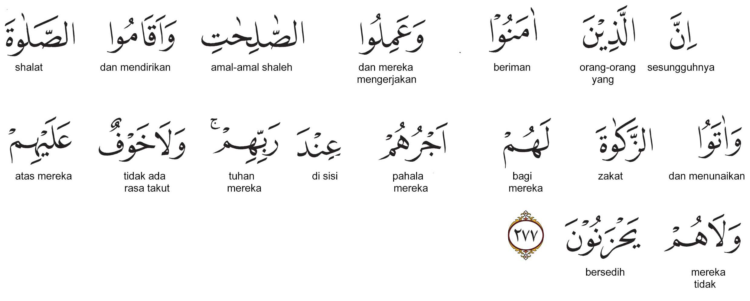 إِنَّ الَّذِينَ آمَنُوا وَعَمِلُوا الصَّالِحَاتِ وَأَقَامُوا الصَّلَاةَ وَآتَوُا الزَّكَاةَ لَهُمْ أَجْرُهُمْ عِنْدَ رَبِّهِمْ وَلَا خَوْفٌ عَلَيْهِمْ وَلَا هُمْ يَحْزَنُونَ