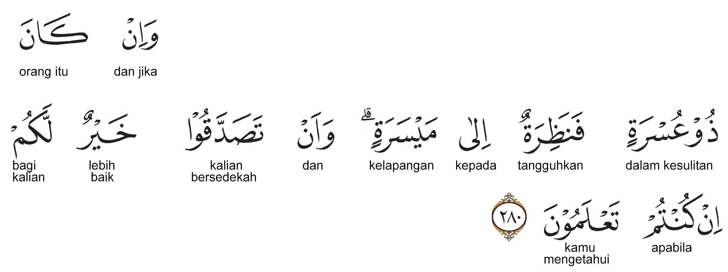 Kemenag RI 2019:Jika dia (orang yang berutang itu) dalam kesulitan, berilah tenggang waktu sampai dia memperoleh kelapangan. Kamu bersedekah (membebaskan utang) itu lebih baik bagimu apabila kamu mengetahui(-nya). Prof. Quraish Shihab:Dan jika dia (orang yang berutang itu) dalam kesulitan, maka berilah tangguh sampai dia lapang. Dan bersedekah itu lebih baik bagi kamu, jika kamu mengetahui. Prof. HAMKA:Dan jika ada yang kesusahan maka berilah tempo sampai ada kelapangan, tetapi kalau kamu bersedekah, adalah itu lebih baik buat kamu jikalau kamu ketahui.