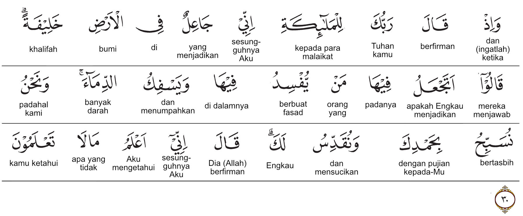 Kemenag RI 2019:(Ingatlah) ketika Tuhanmu berfirman kepada para malaikat, “Aku hendak menjadikan khalifah ) di bumi.” Mereka berkata, “Apakah Engkau hendak menjadikan orang yang merusak dan menumpahkan darah di sana, sedangkan kami bertasbih memuji-Mu dan menyucikan nama-Mu?” Dia berfirman, “Sesungguhnya Aku mengetahui apa yang tidak kamu ketahui.” Prof. Quraish Shihab:(Ingatlah), ketika Tuhan Pemelihara kau berfirman kepada para malaikat: “Sesungguhnya Aku hendak menjadikan satu khalifah di bumi." Mereka (para malaikat) berkata: `Apakah Engkau hendak menjadikan di (bumi) .siapa yang akan membuat kerusakan padanya dan menumpahkan darah, padahal kami (selalu) bertasbih dengan memuji-Mu dan menyucikan Mu? Dia berfirman: “Sesungguhnya Aku mengetahui apa yang tidak kamu ketahui." Prof. HAMKA:Dan (ingatlah) tatkala Tuhan engkau berkata kepada Malaikat, "Sesungguhnya, Aku hendak menjadikan di bumi seorang khalifah." Berkata mereka, "Apakah Engkau hendak menjadikan padanya orang yang merusak di dalamnya dan menumpahkan darah, padahal kami bertasbih dengan memuji Engkau dan memuliakan Engkau?" Dia berkata, "Sesungguhnya, Aku lebih mengetahui apa yang tidak kamu ketahui."