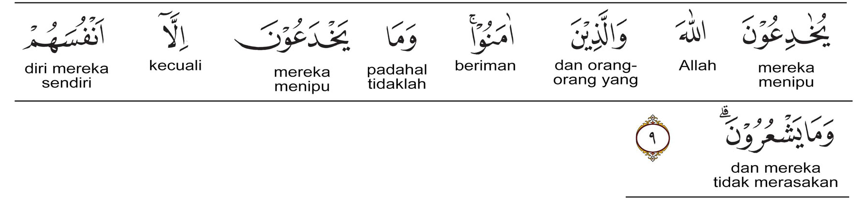 Kemenag RI 2019:Mereka menipu Allah dan orang-orang yang beriman, padahal mereka hanyalah menipu diri sendiri tanpa mereka sadari. Prof. Quraish Shihab:Mereka bermaksud dengan sungguh-sungguh menipu Allah dan orang-orang yang beriman, padahal mereka hanya menipu diri mereka sendiri, sedangkan mereka tidak menyadari. Prof. HAMKA:Hendak mereka coba memperdayakan Allah dan orang-orang yang beriman, padahal tidak yang mereka perdayakan, kecuali diri mereka sendiri, dan tidaklah mereka rasakan.