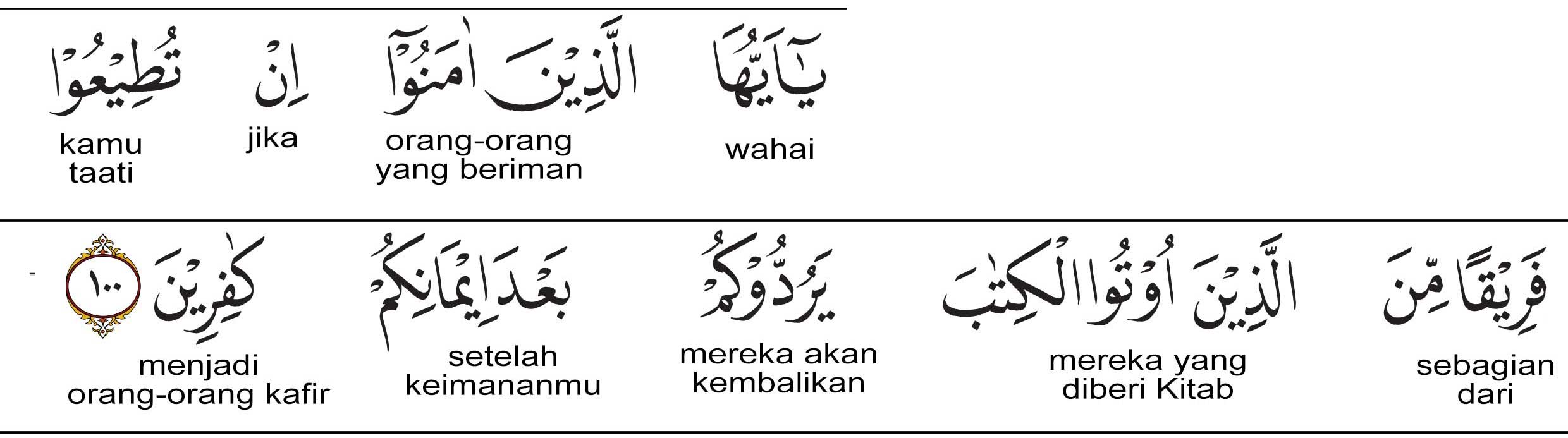 "Wahai orang-orang yang beriman, seanda,inya kamu mengi,kuti sebagian dari orang-orang yang diberi al-Kitab, niscaya mereka akan mengembalikan kamu menjadi orang kafir sesudah kamu beriman.