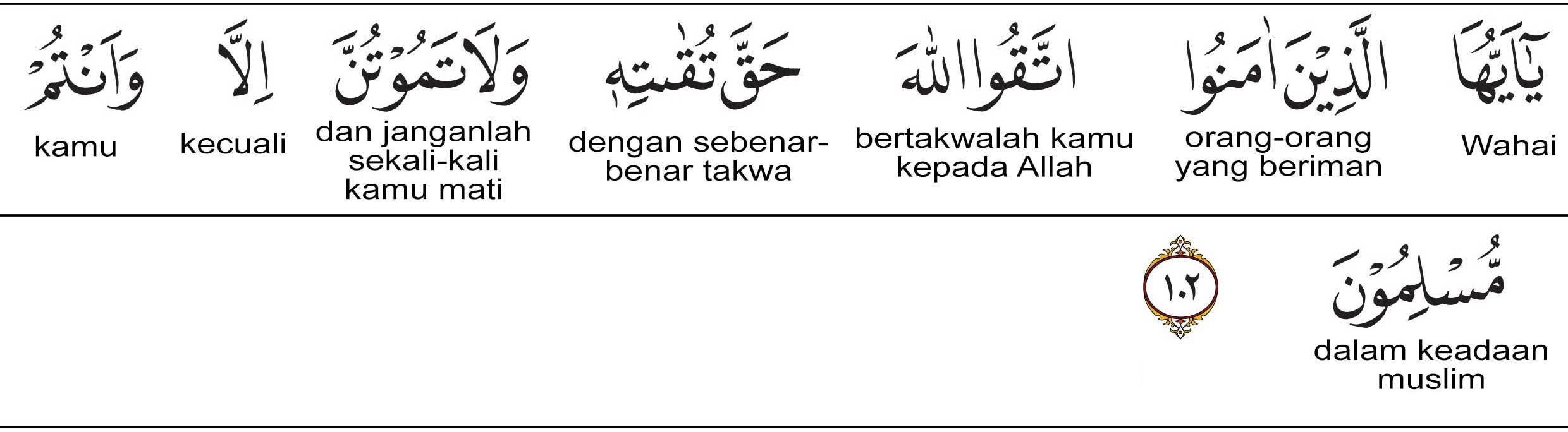Hai orang-orang yang beriman! Bertakwalah kepada Allah sebenar-benar takwa kepada-Nya; dan janganlah sekali-kali kamu mati melainkan dalam keadaan Muslim (tunduk patuh dan berserah diri kepada Allah swt.).