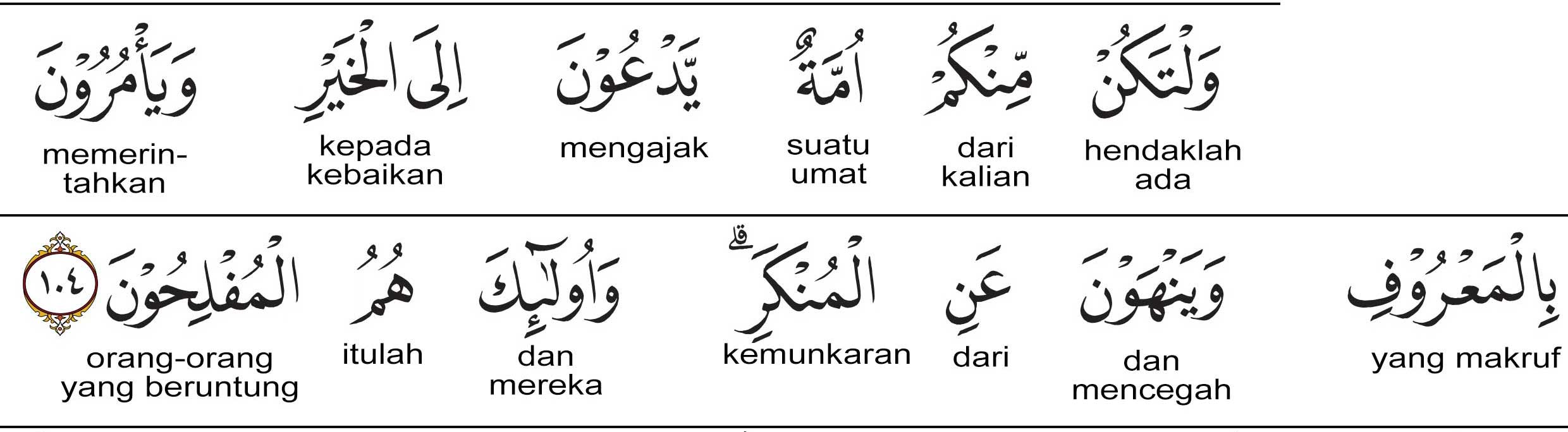 Dan hendaklah ada di antara kamu (segolongan) umat yang mengajak kepada kebajikan, menyuruh kepada yang ma‘ruf dan mencegah yang munkar; merekalah orang-orang yang beruntung.