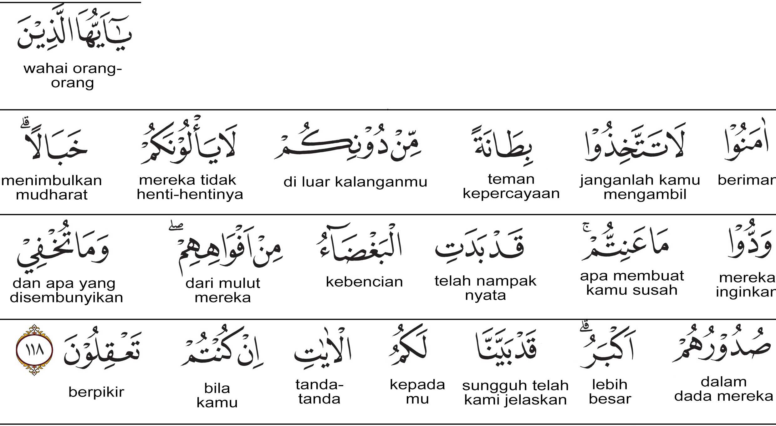 Hai orang-orang yang beriman! Janganlah kamu mengambil orangorang yang di luar kalangan kamu" menjadi teman kepercayaan kamu, (karena) mereka tidak henti-hentinya (menimbulkan) kemudharatan bagi kamu. Mereka menginginkan apa yang menyusahkan kamu. Sungguh, telah nyata kebencian dari mulut mereka, dan apa yang disembunyikan oleh hati mereka lebih besar. Sungguh, Kami telah menjelaskan kepada kamu tanda-tanda (yang membedakan kawan dari lawan), jika kamu berpikir.